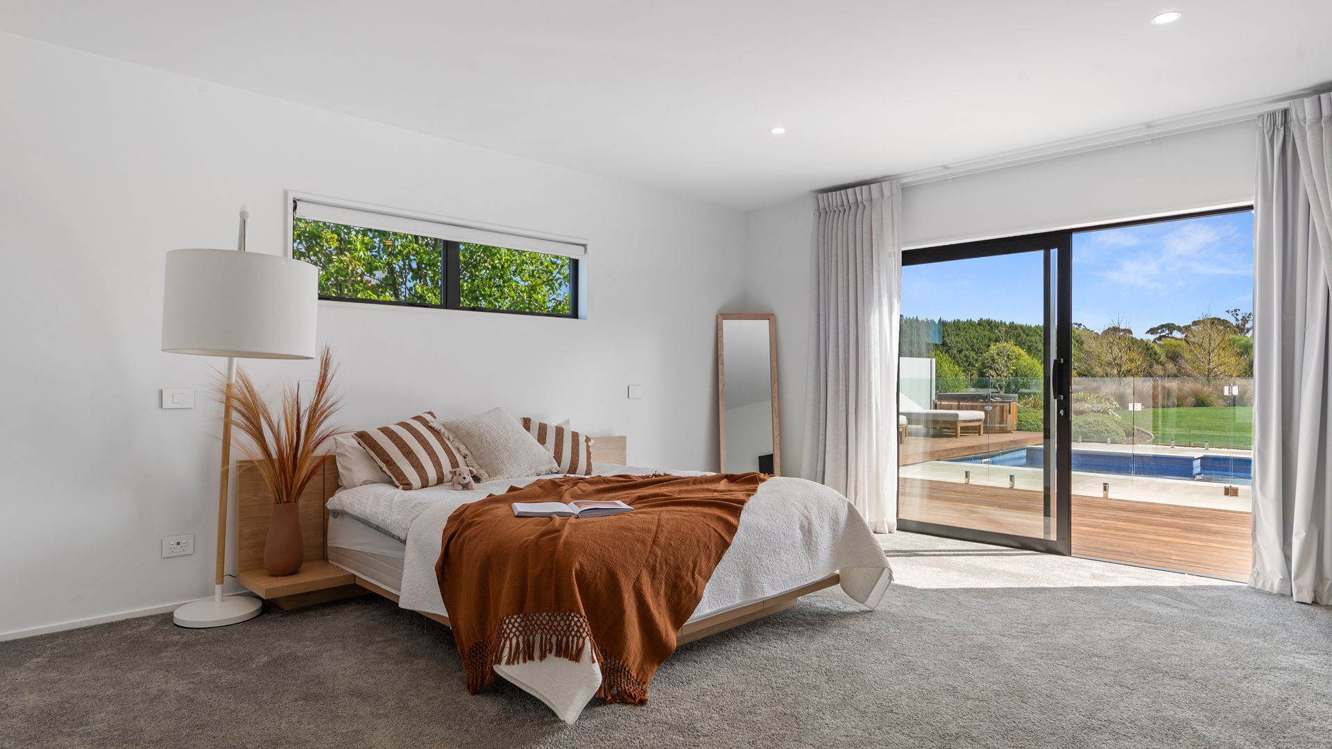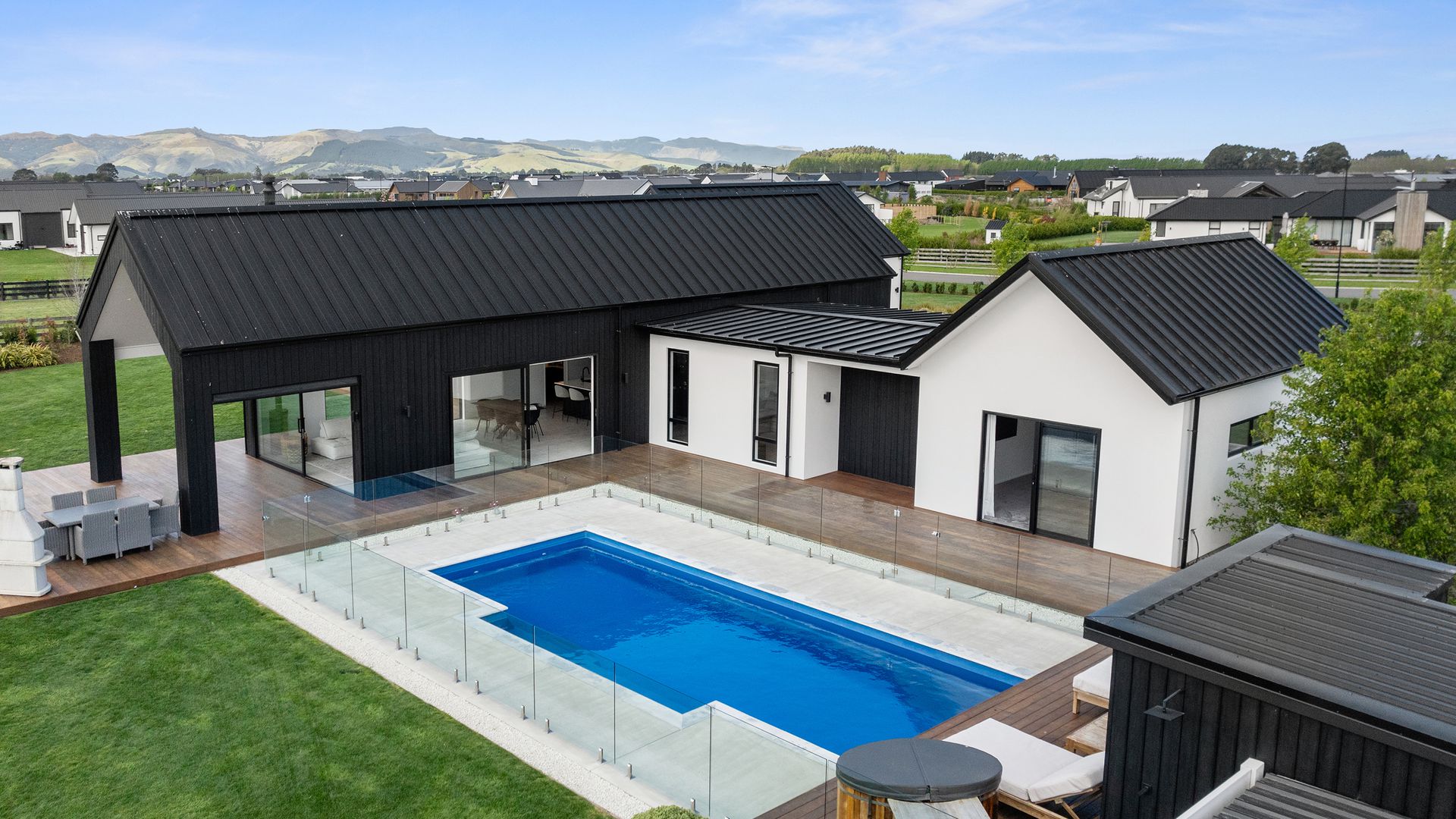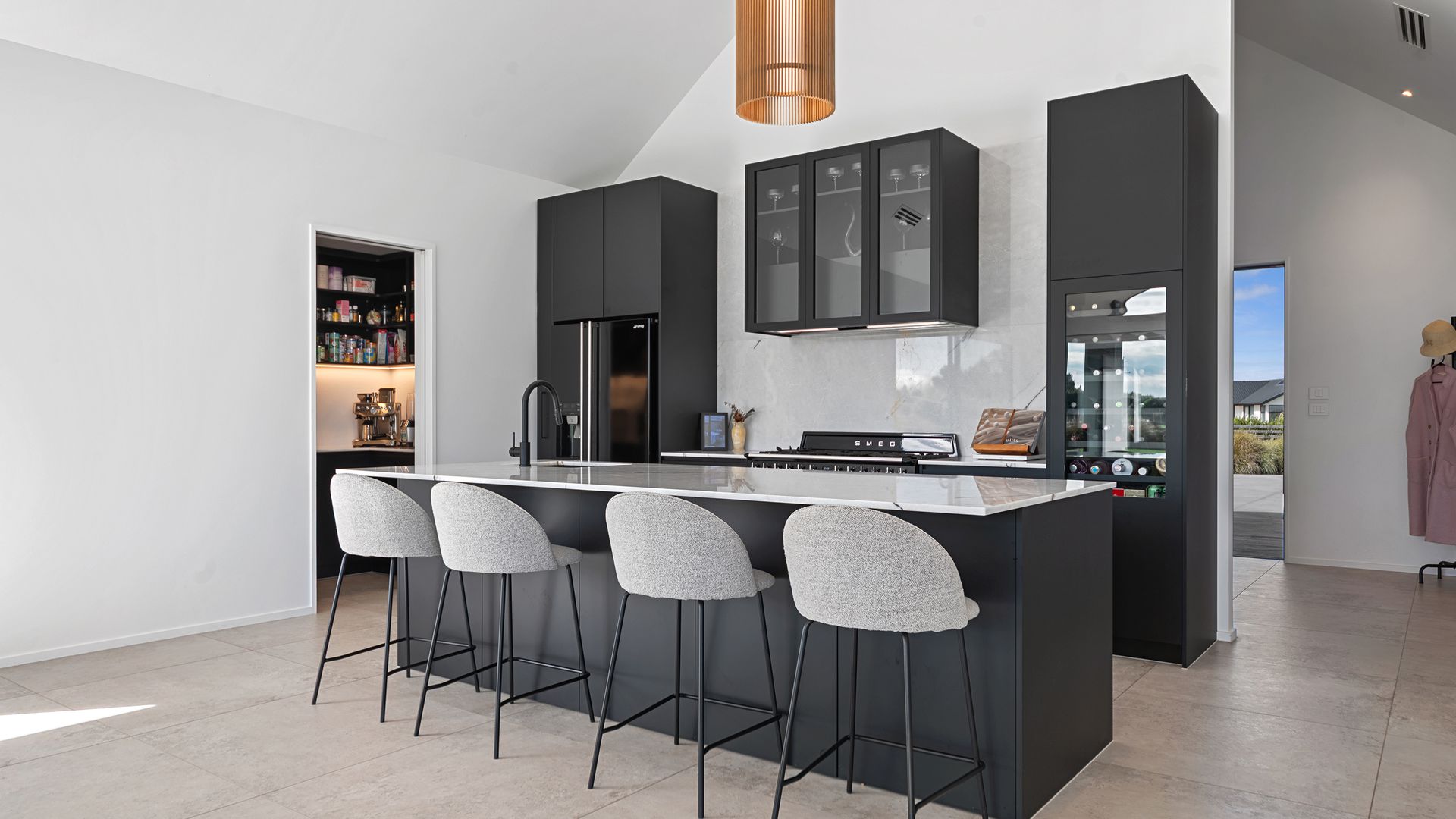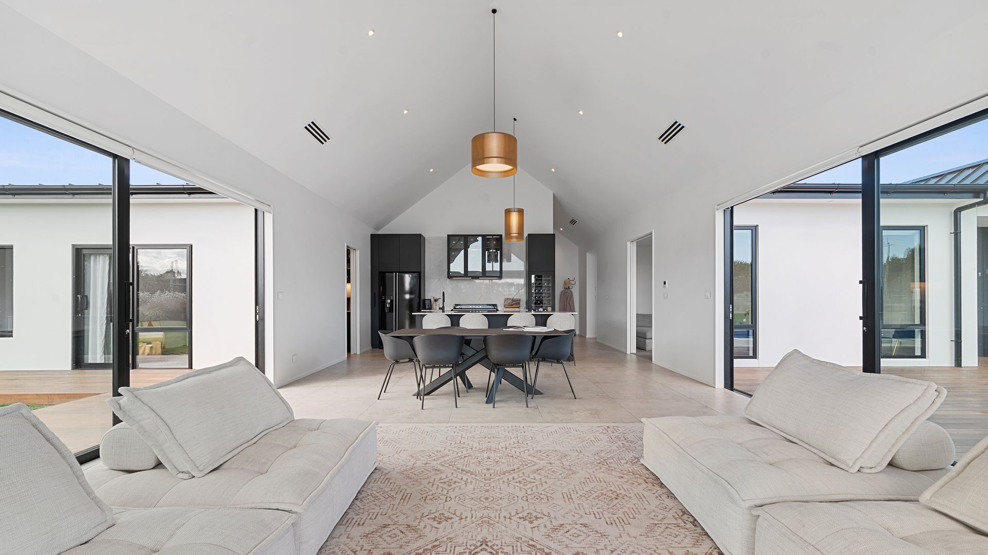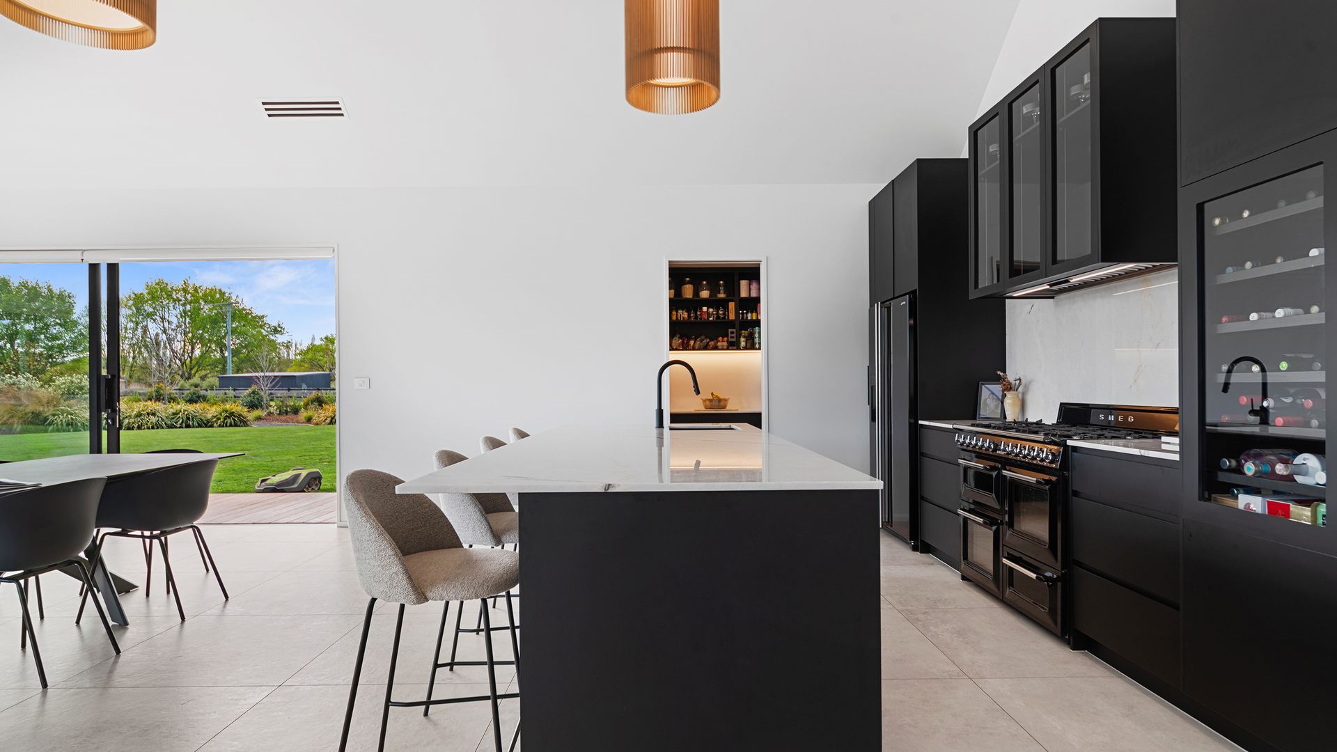 The beautifully crafted home offers modern elegance combined with functional and practical everyday living. The heart of the home is the kitchen, featuring an expansive standalone bench with a marble benchtop, designer cabinetry, a Smeg Victoria stove, and a butler's pantry. This overlooks the expansive, light, and bright living area, featuring a cathedral ceiling and easy access to the covered outdoor entertaining area and heated pool area.