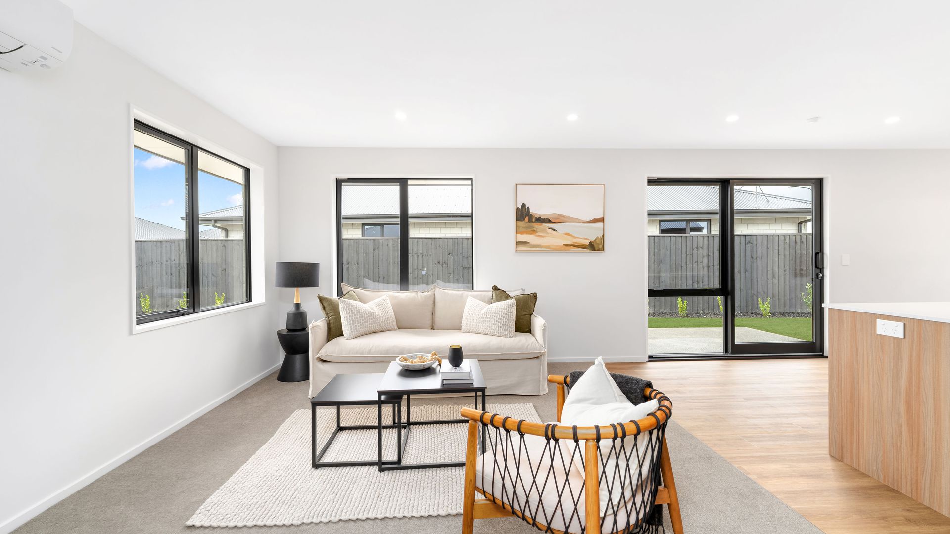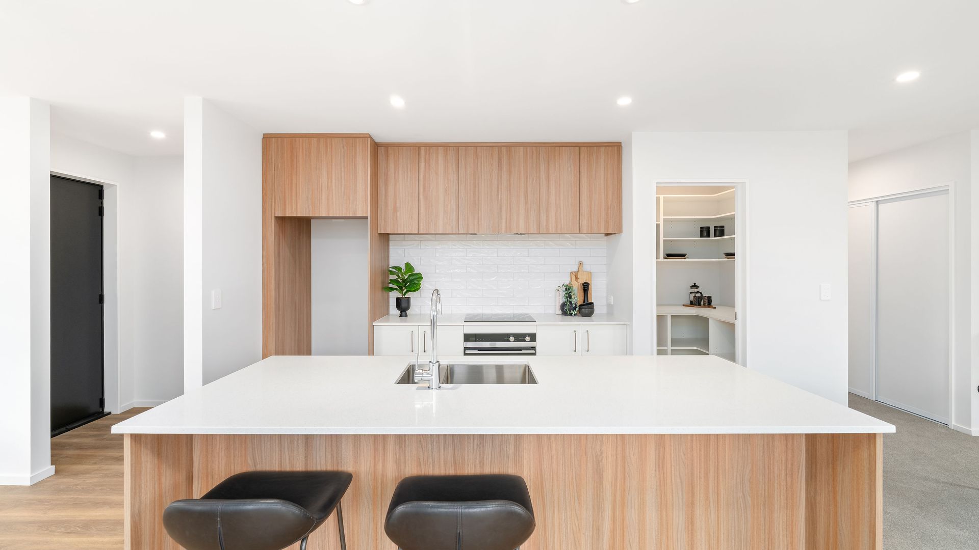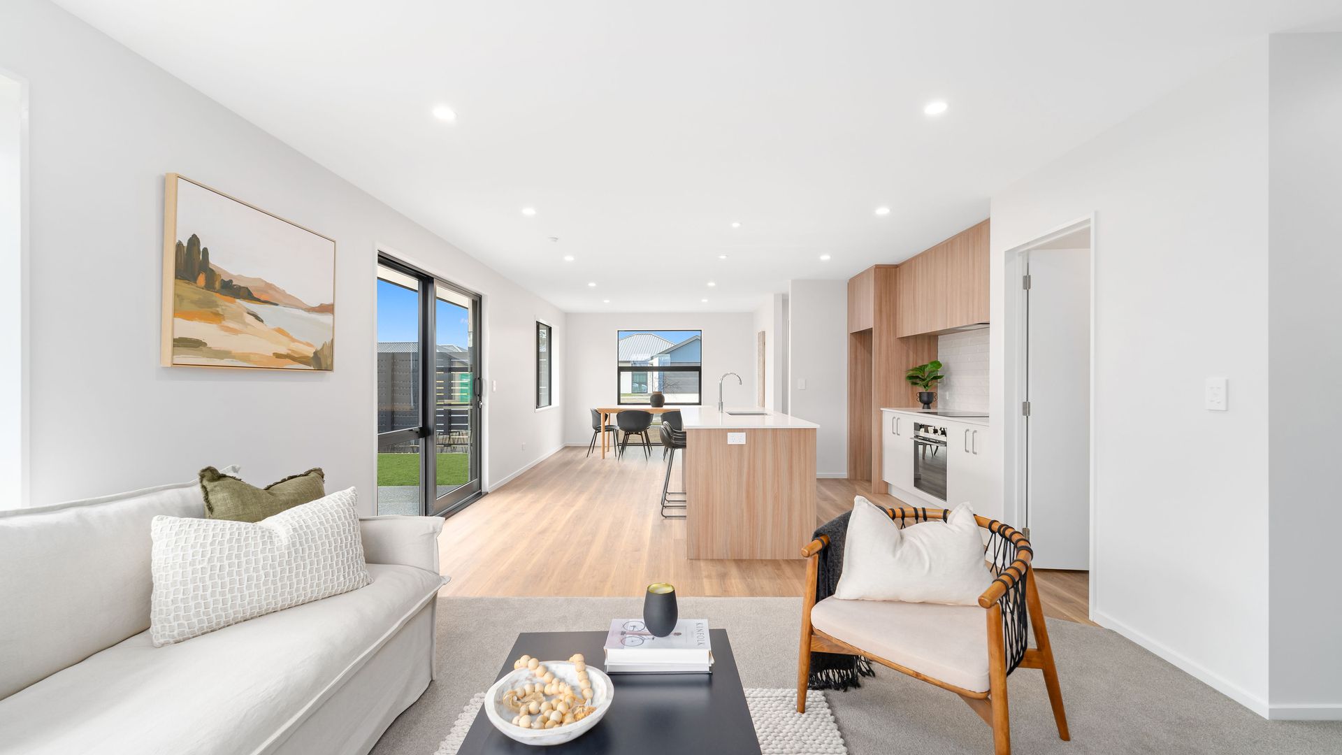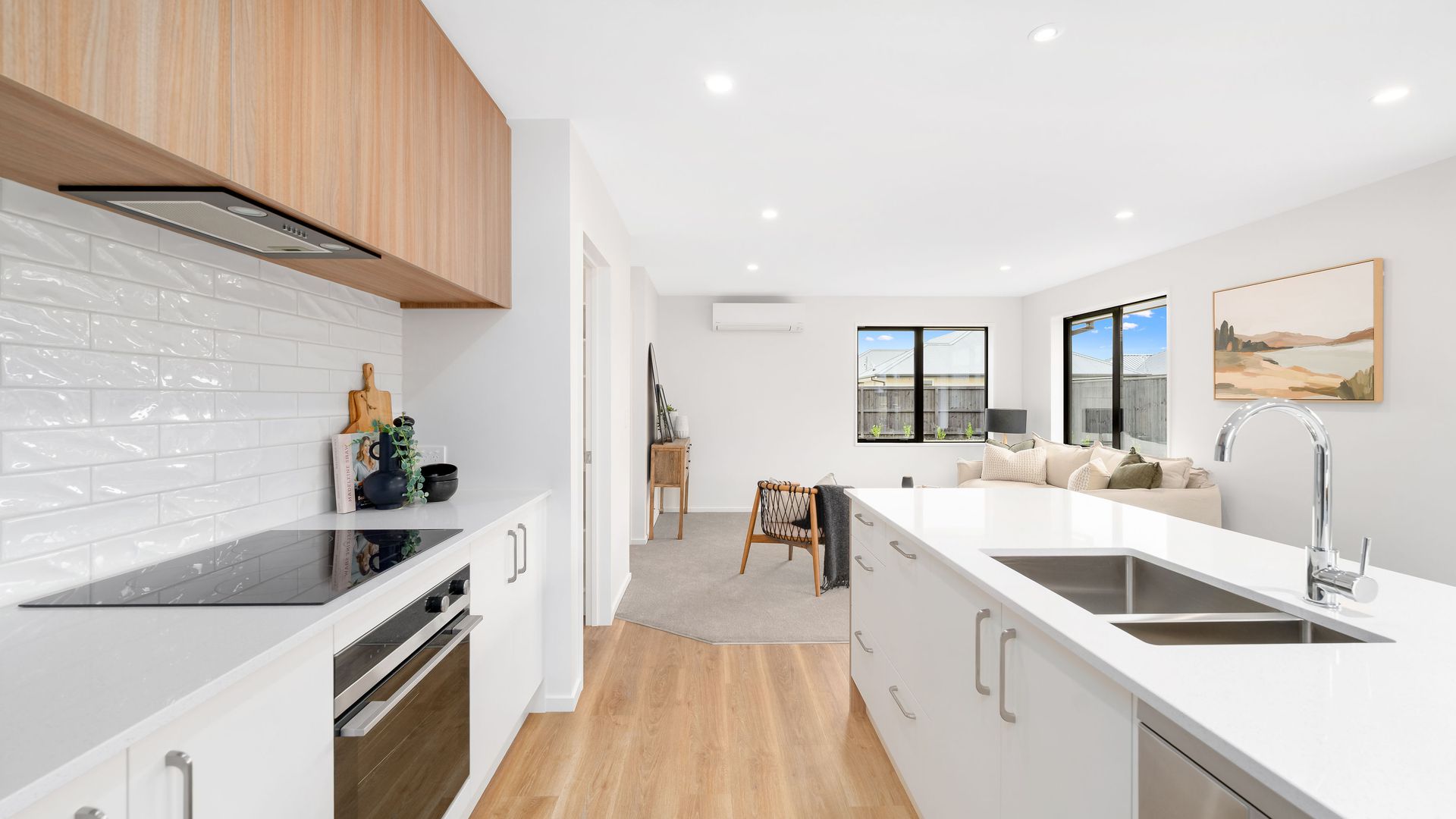 Sleek open-plan kitchen, complete with a walk-in pantry, seamlessly connects to the dining and living areas, creating a practical, modern hub for everyday life and entertaining. Large sliders open to a finished patio and neat, low-maintenance gardens, keeping outdoor living straightforward and enjoyable from day one.