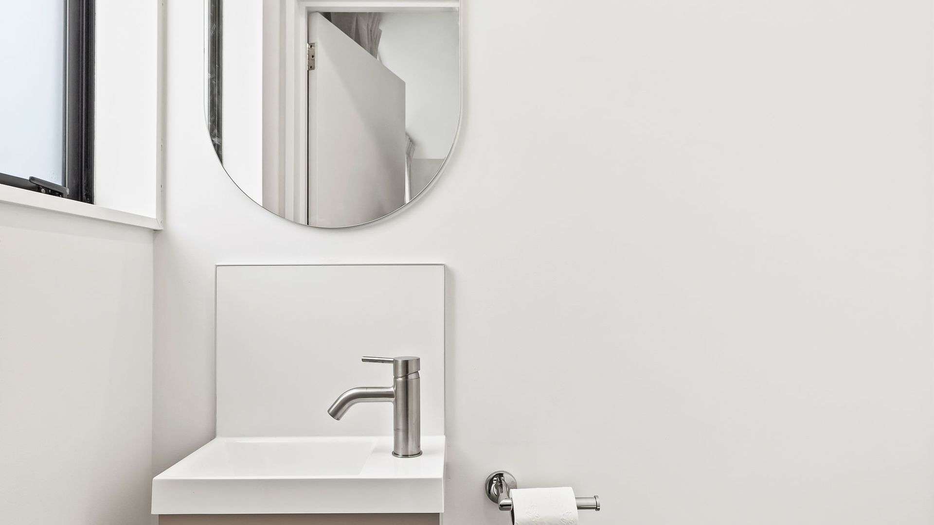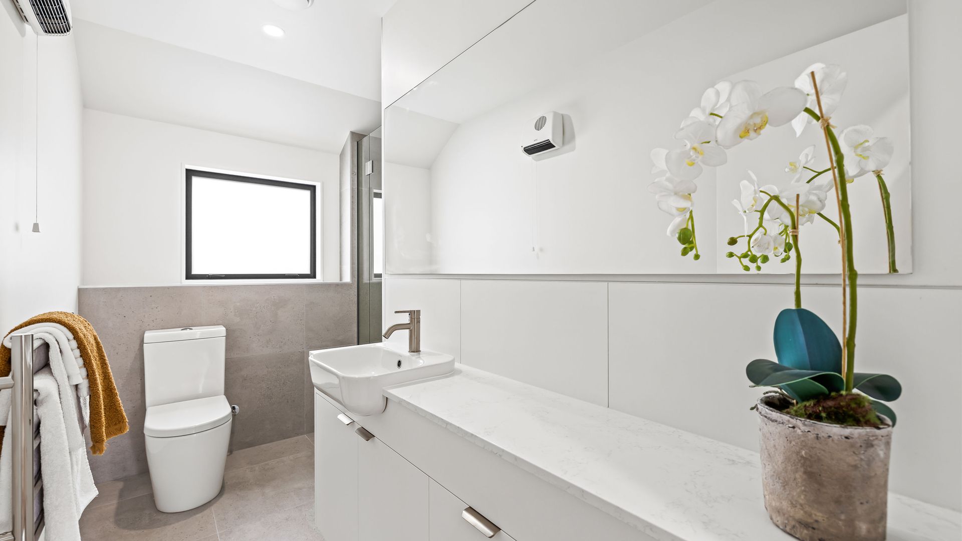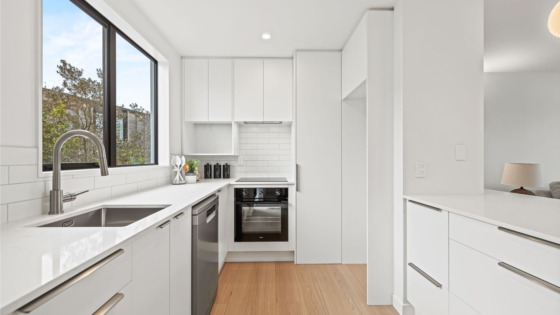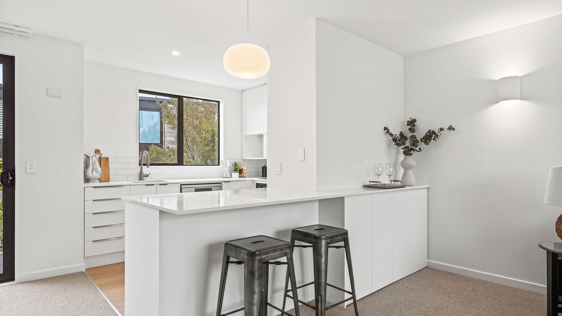 Upstairs, the living level offers effortless flow through open-plan lounge and dining spaces, complemented by a sleek, streamlined kitchen. A north-facing balcony extends the living area outdoors, capturing light and warmth throughout the day.