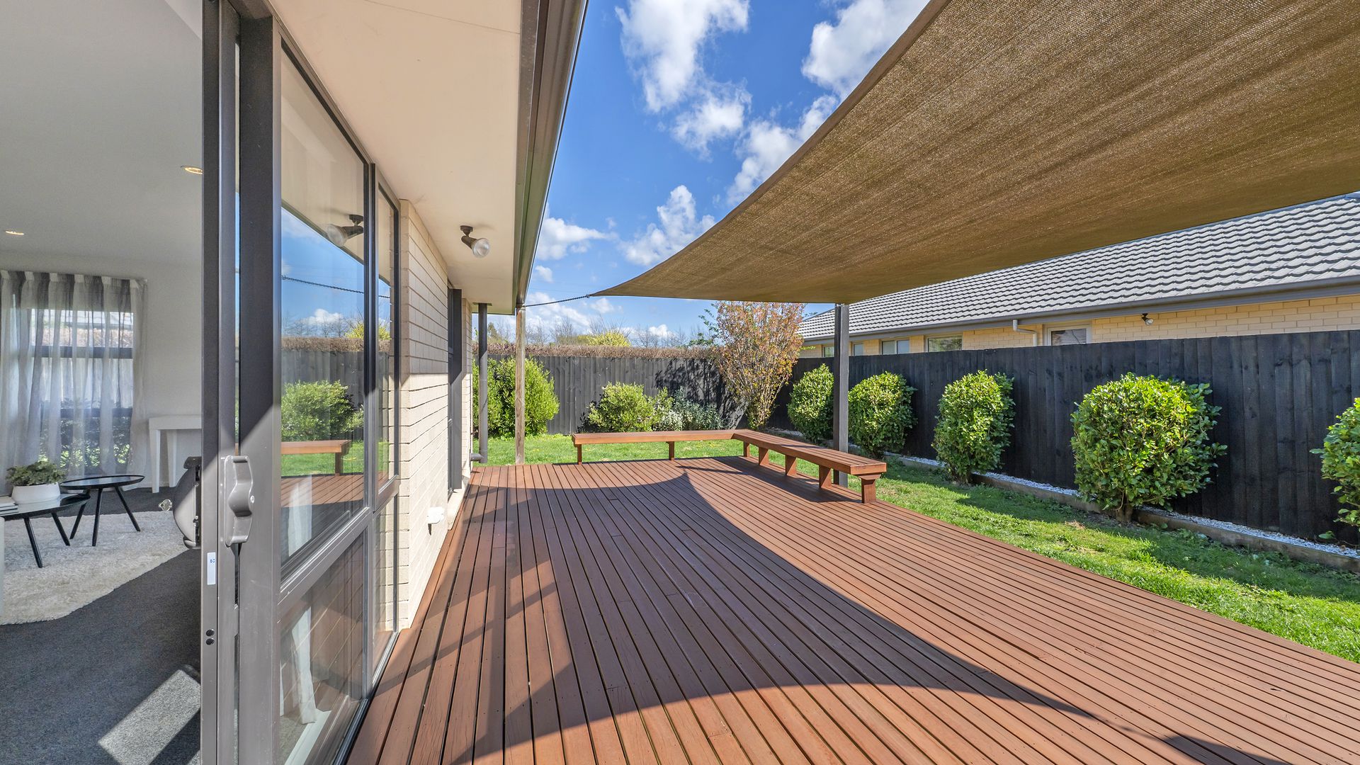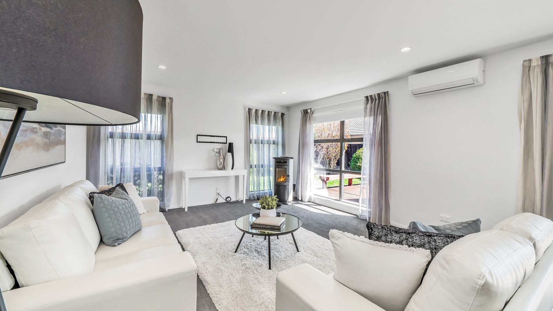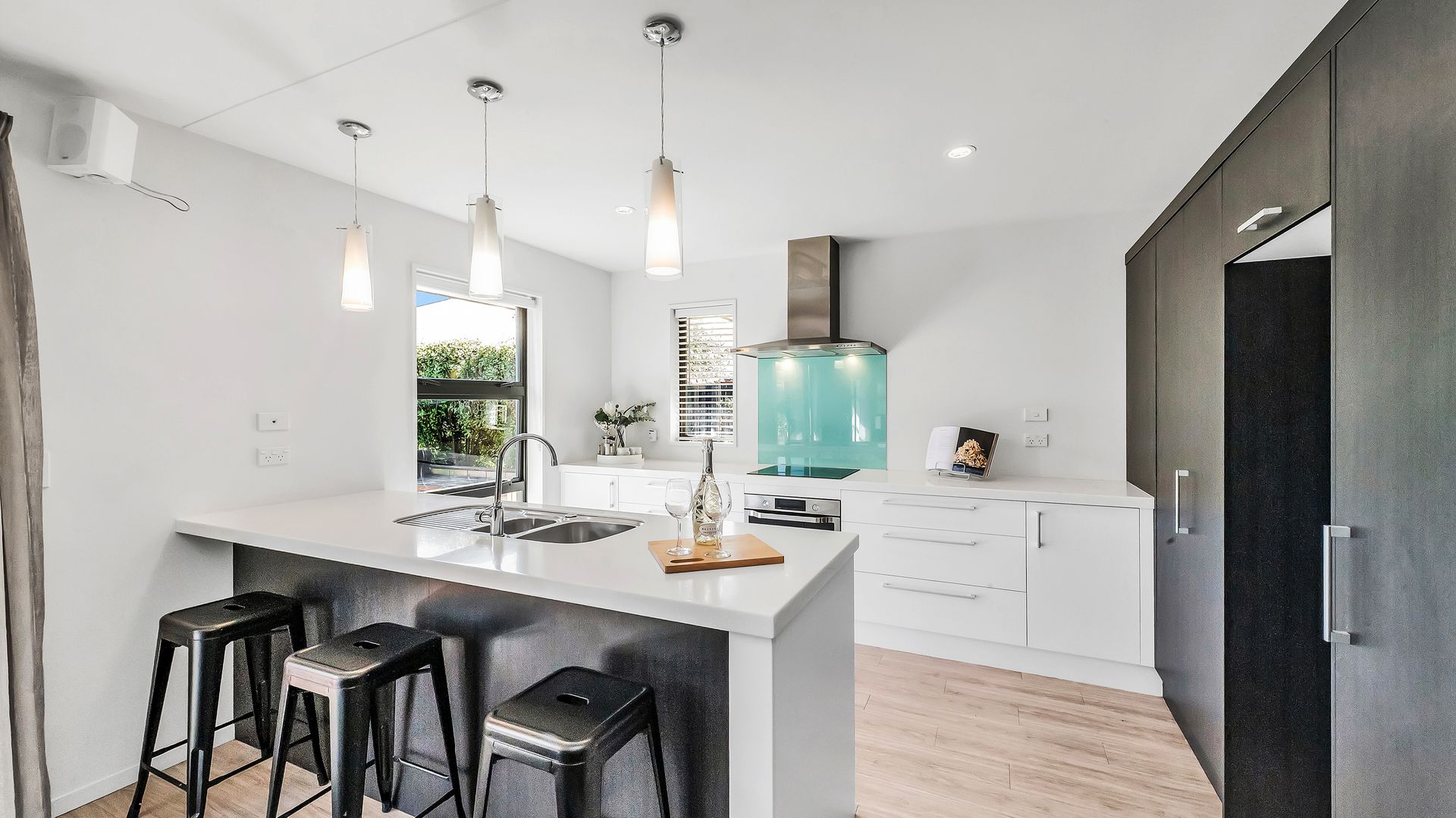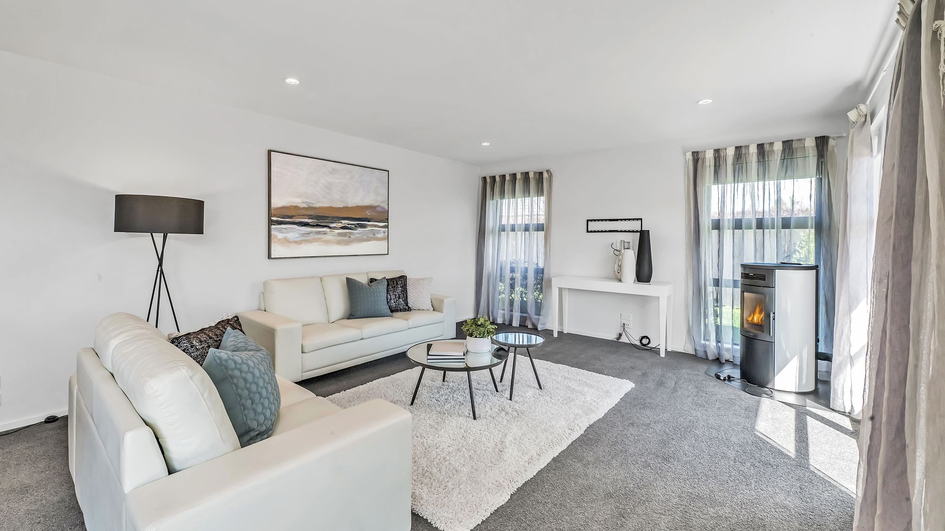 Down a quiet lane in Leeston, this three-bedroom home has been cleverly designed to maximise space and light, giving a sense of roominess that belies its footprint. From the spacious entrance, you enter through double doors into the open-plan kitchen, dining, and living area, which is bright and functional. The area features stone benchtops, a double sink with an InSinkerator, an induction cooktop, and is warmed by a pellet fire and a heat pump.