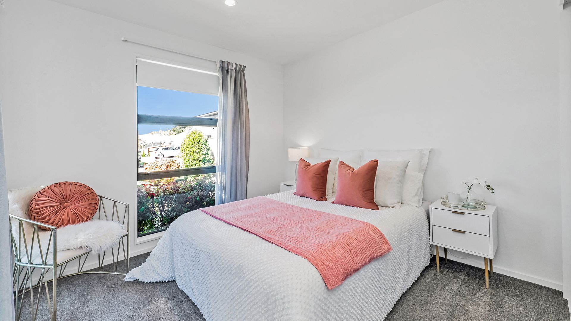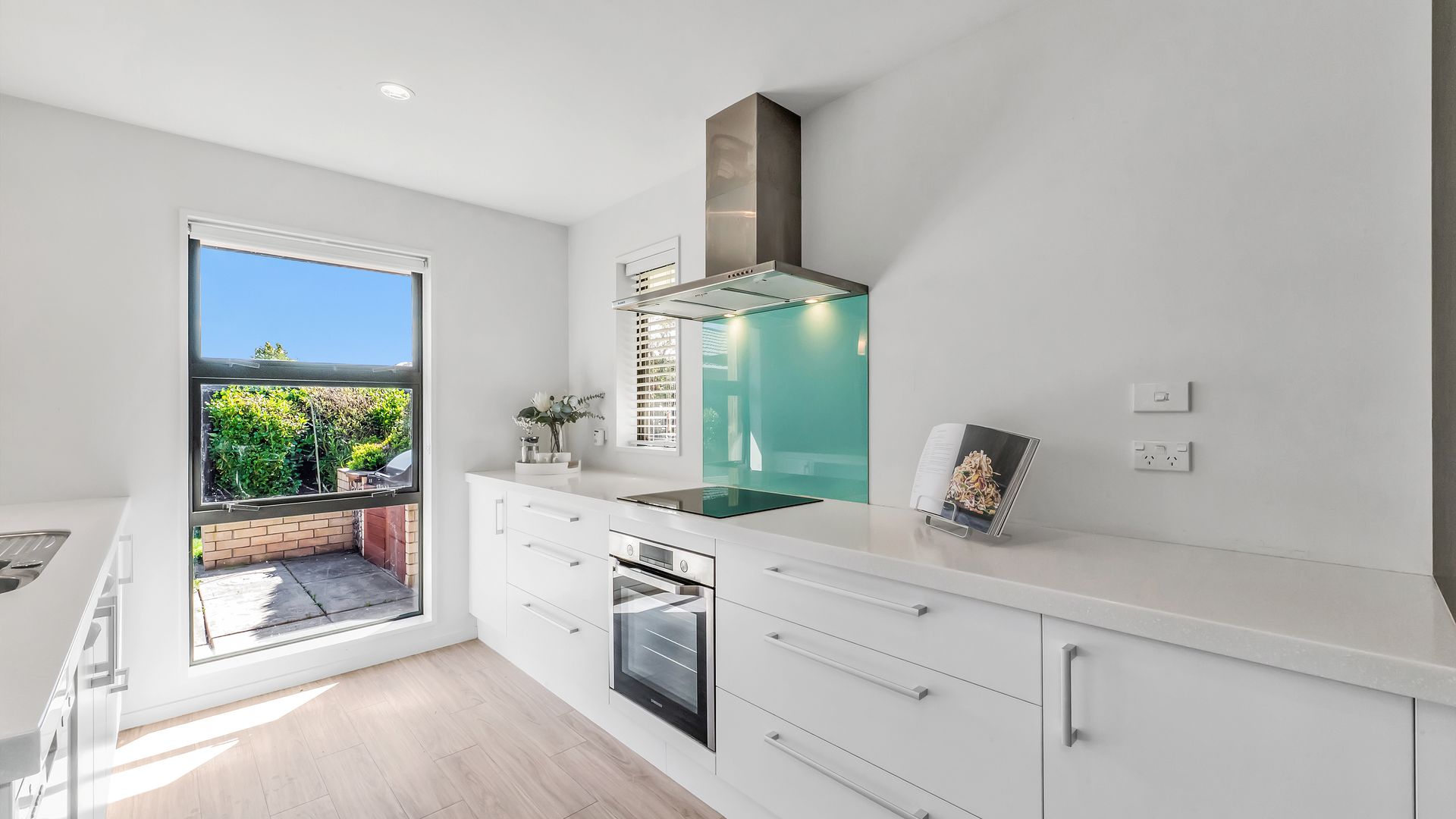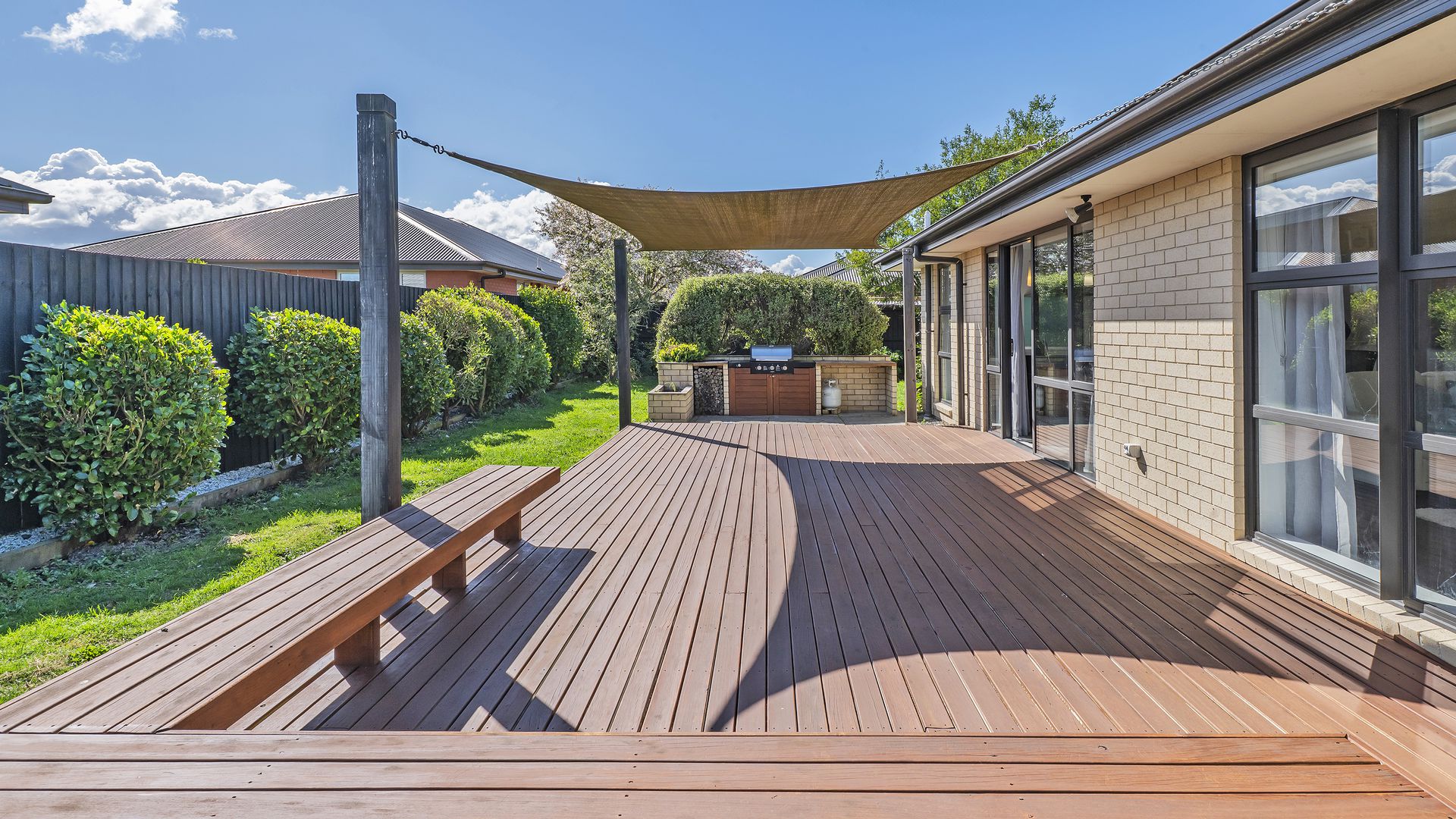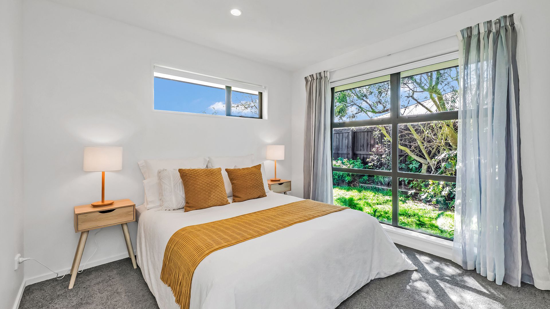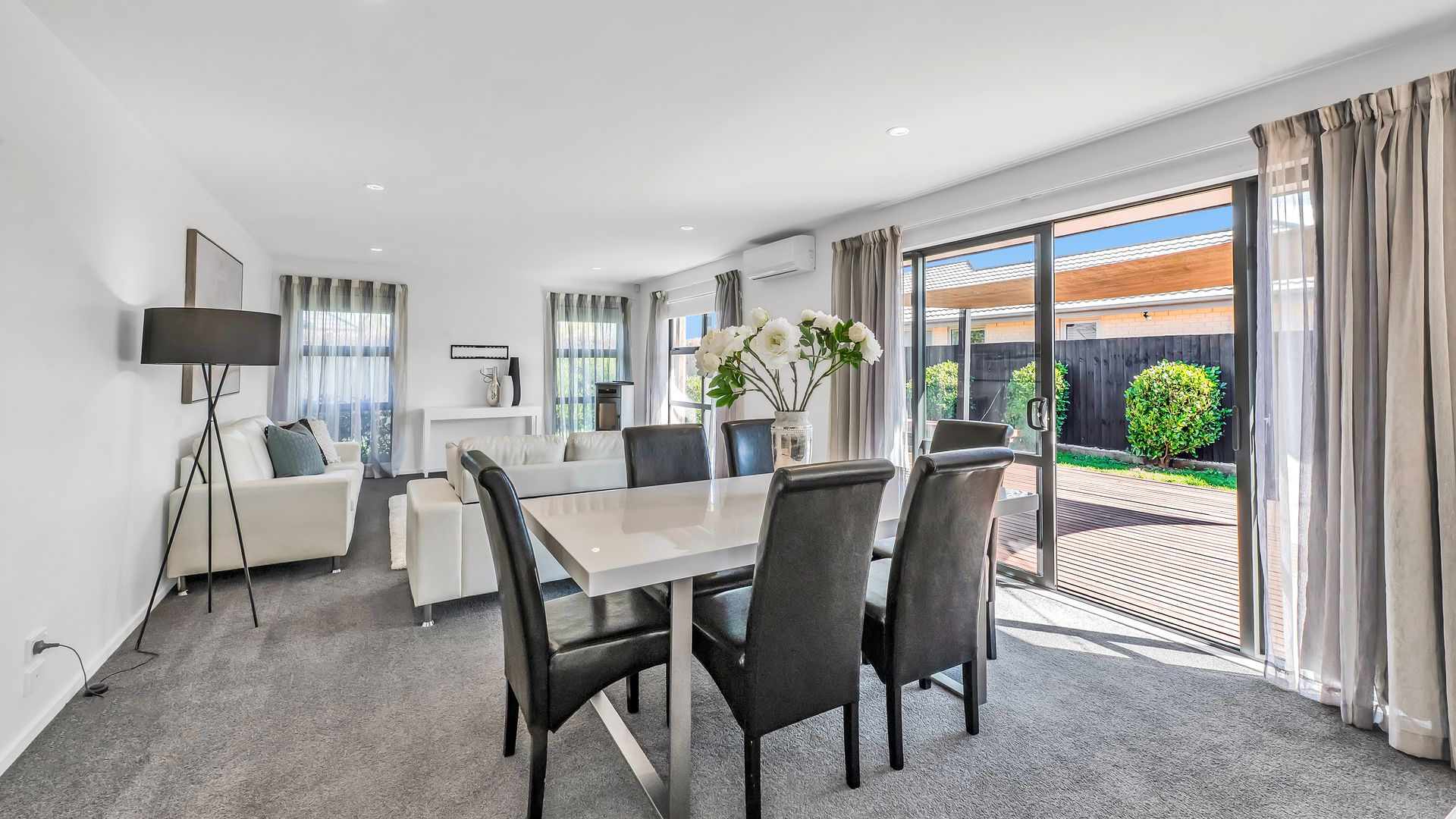 Down a quiet lane in Leeston, this three-bedroom home has been cleverly designed to maximise space and light, giving a sense of roominess that belies its footprint. From the spacious entrance, you enter through double doors into the open-plan kitchen, dining, and living area, which is bright and functional. The area features stone benchtops, a double sink with an InSinkerator, an induction cooktop, and is warmed by a pellet fire and a heat pump.
