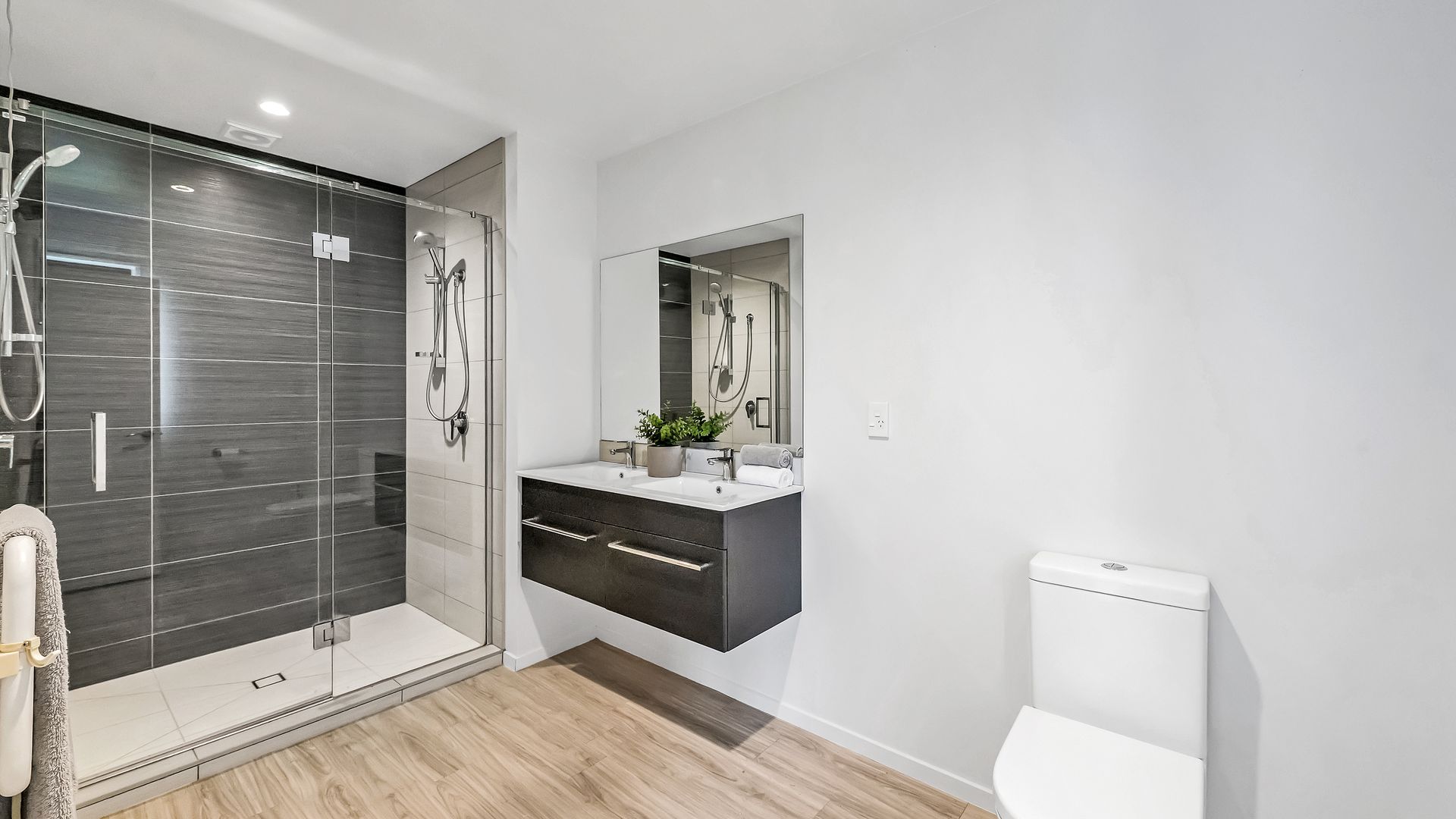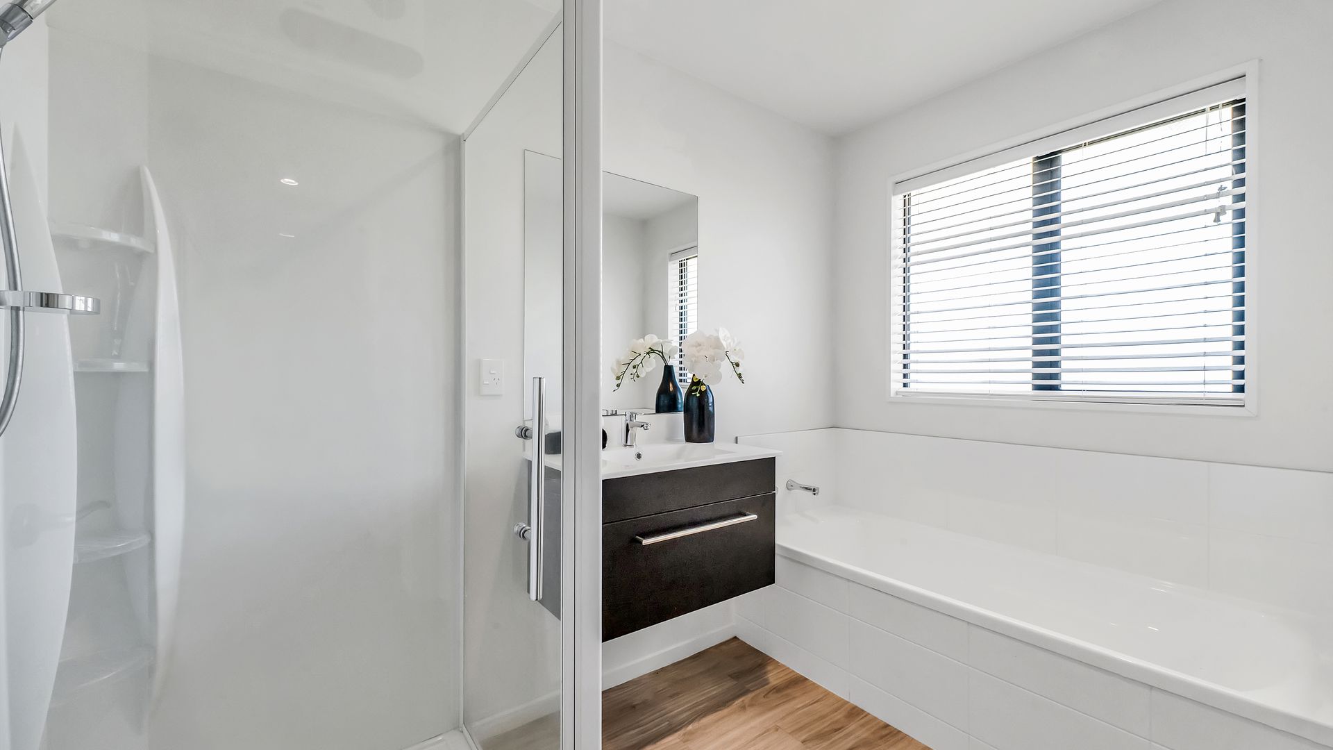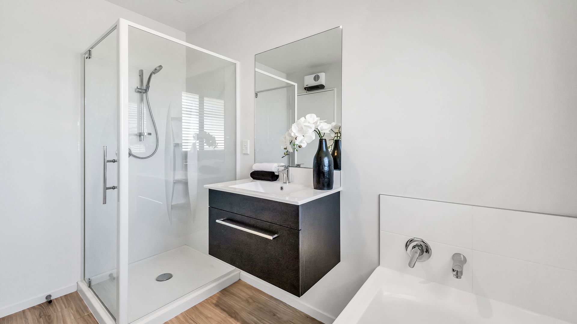 Positioned apart from the other bedrooms, the master suite features a double-tiled shower ensuite and a walk-in wardrobe, while the two additional bedrooms share a family bathroom with a standalone bath and a separate toilet.