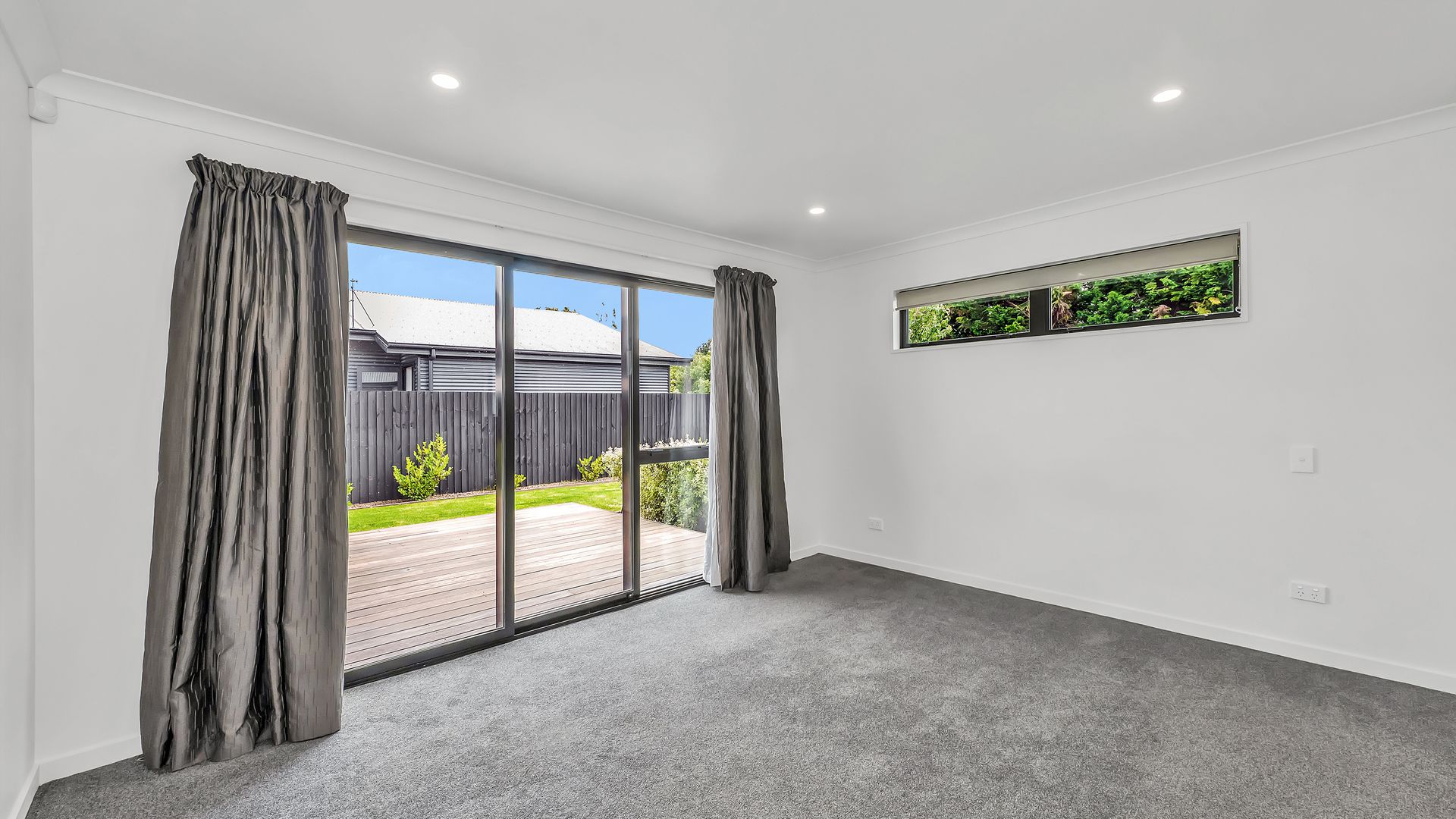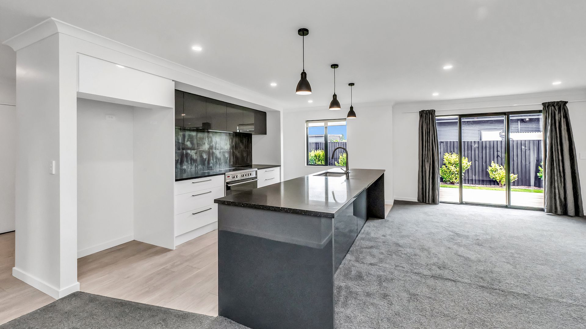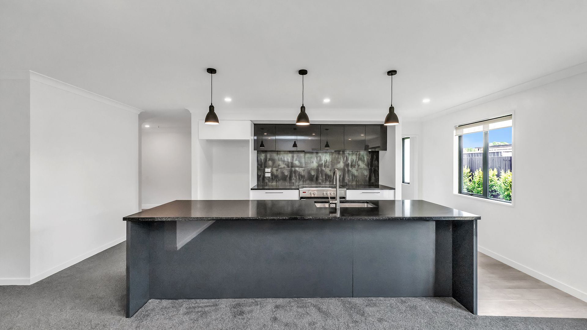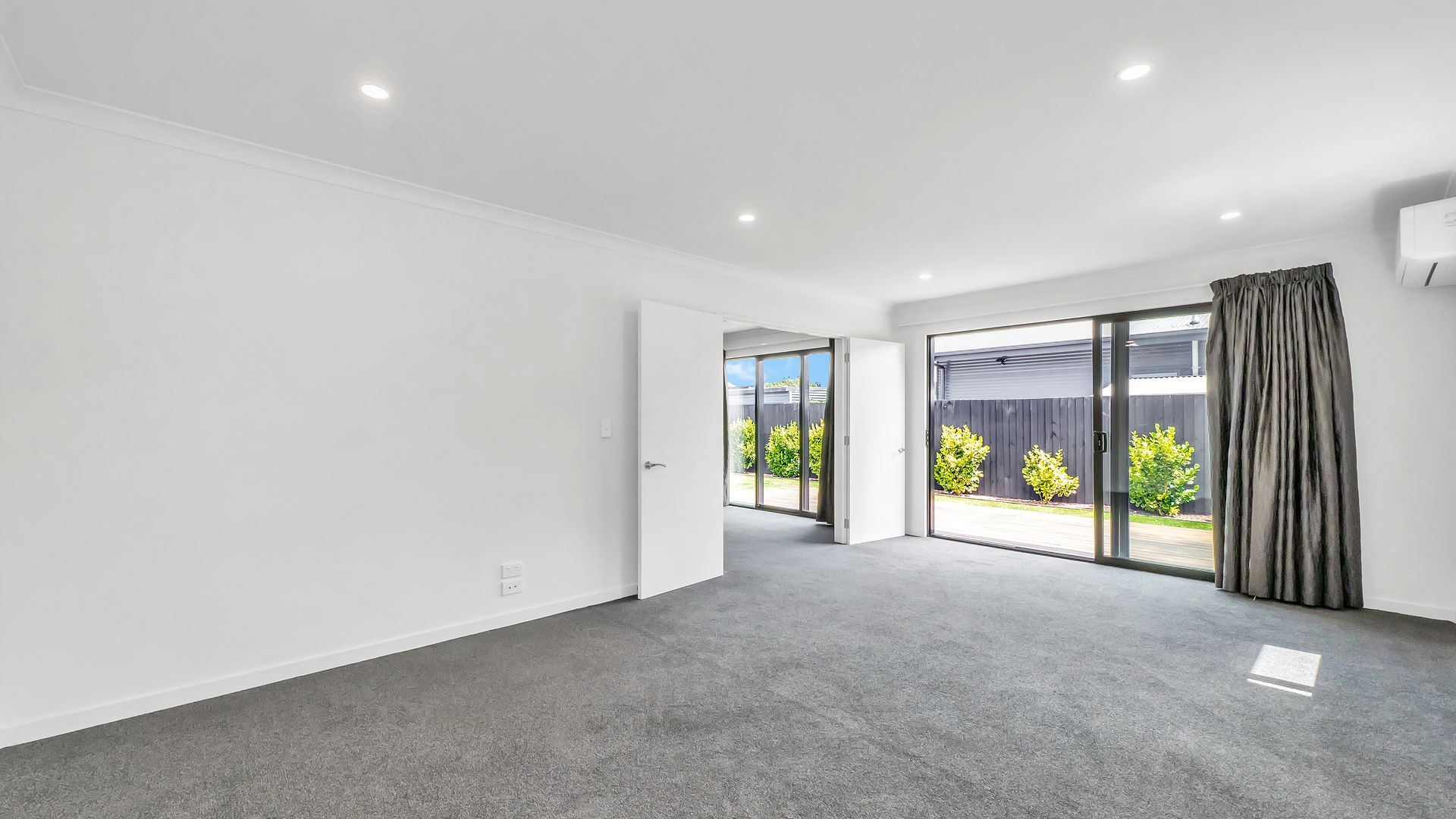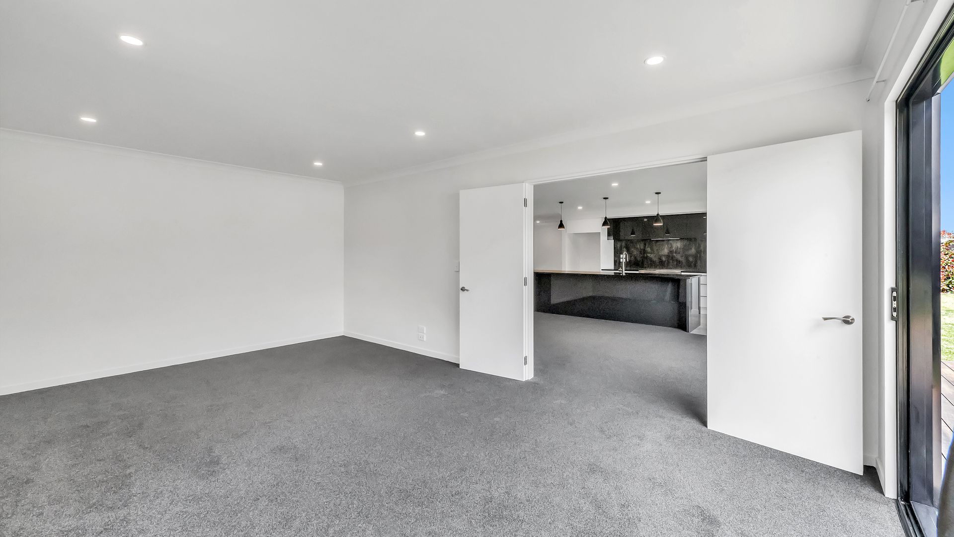 Through the spacious entrance, a sleek, modern kitchen forms the centrepiece of the open-plan living zone, enhanced by a 90cm freestanding oven, ample bench space, and a walk-in pantry. This space flows into the separate lounge, both with sliding door access to the deck.