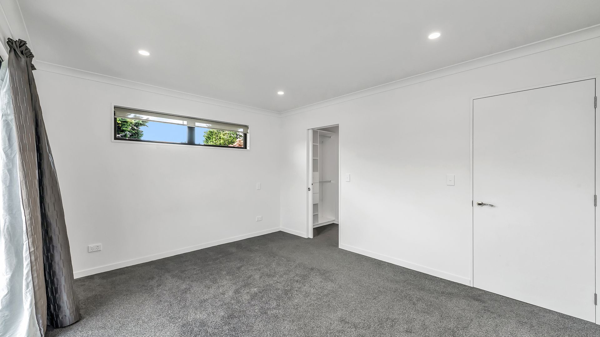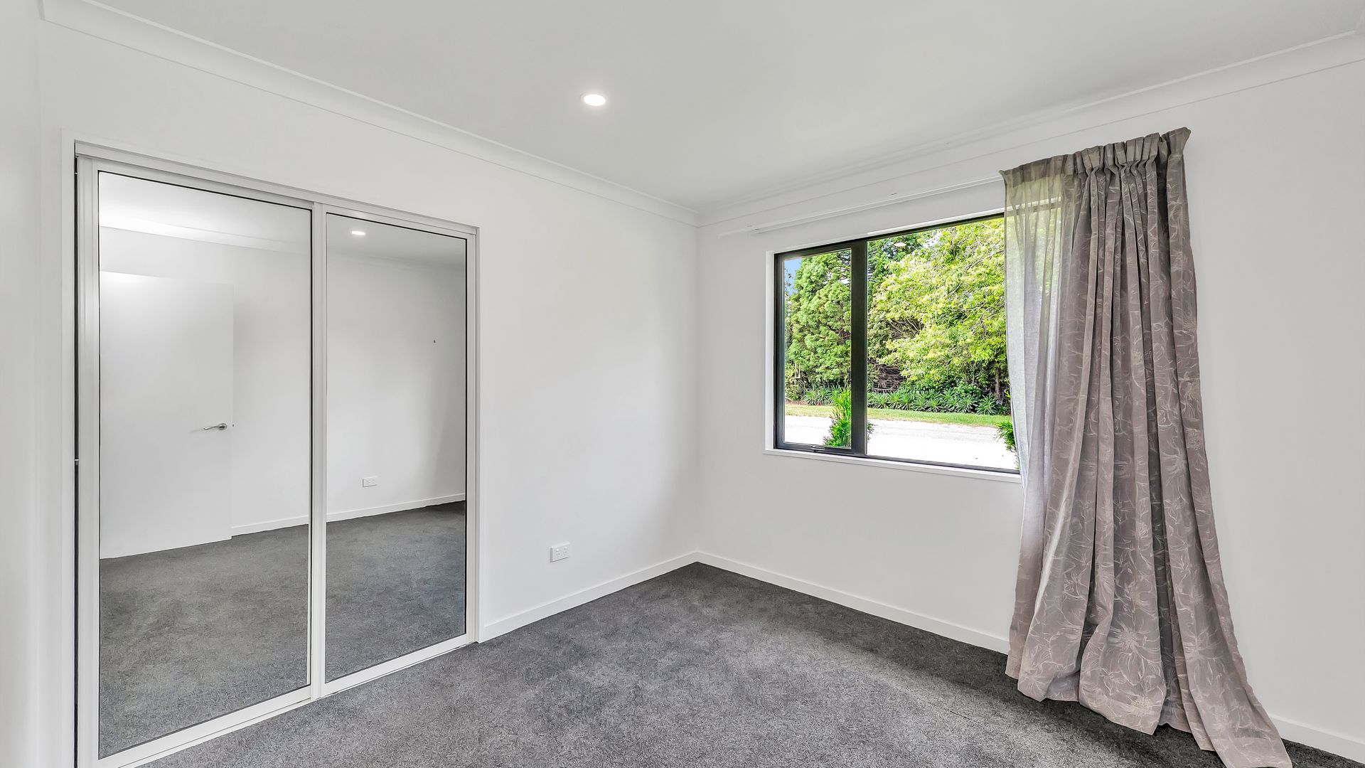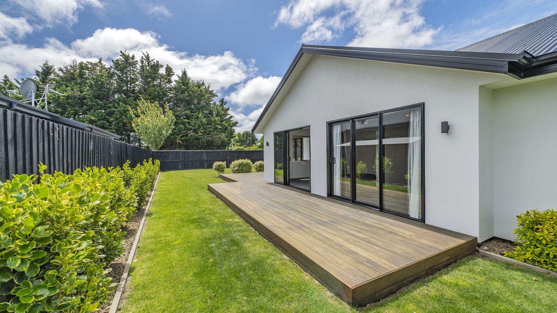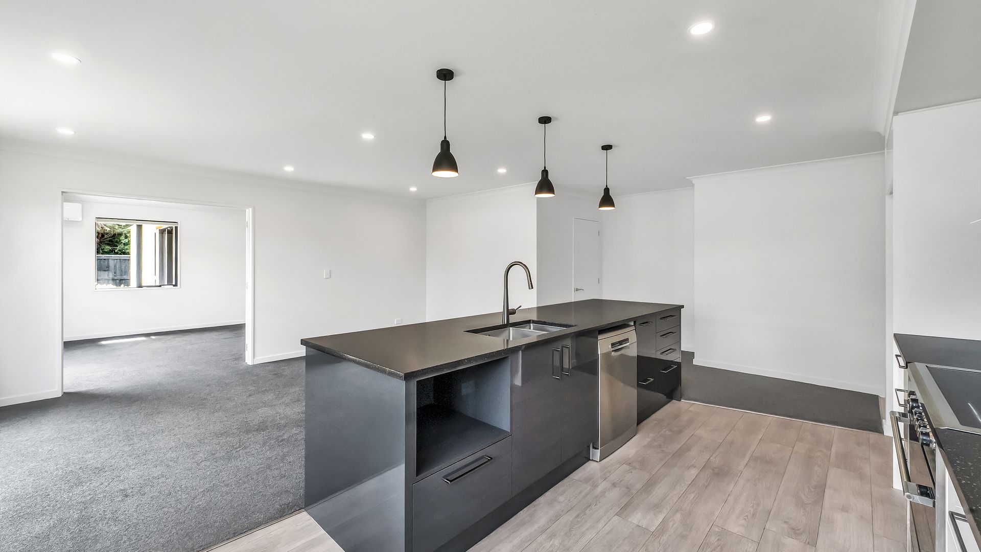Through the spacious entrance, a sleek, modern kitchen forms the centrepiece of the open-plan living zone, enhanced by a 90cm freestanding oven, ample bench space, and a walk-in pantry. This space flows into the separate lounge, both with sliding door access to the deck.
