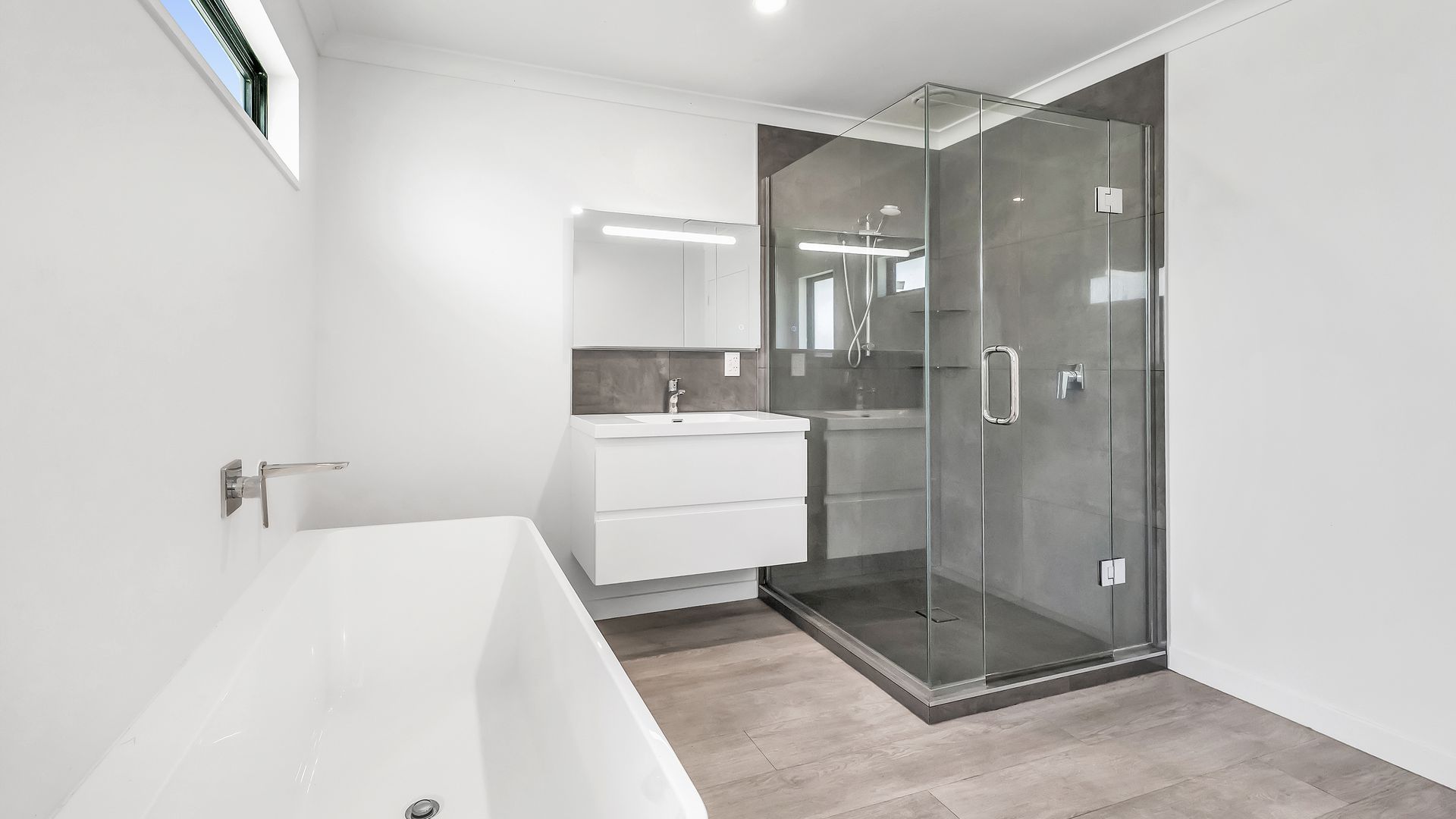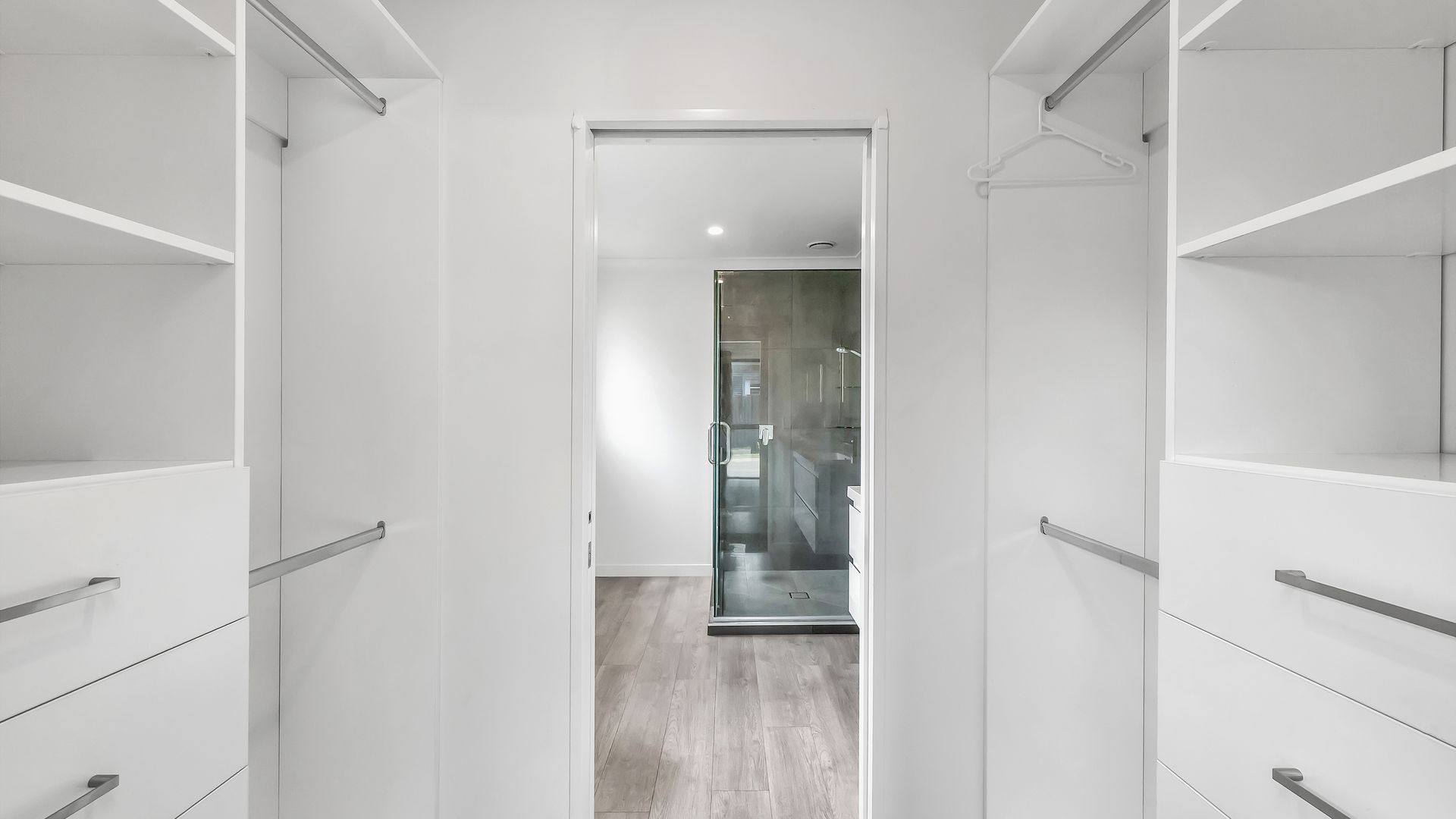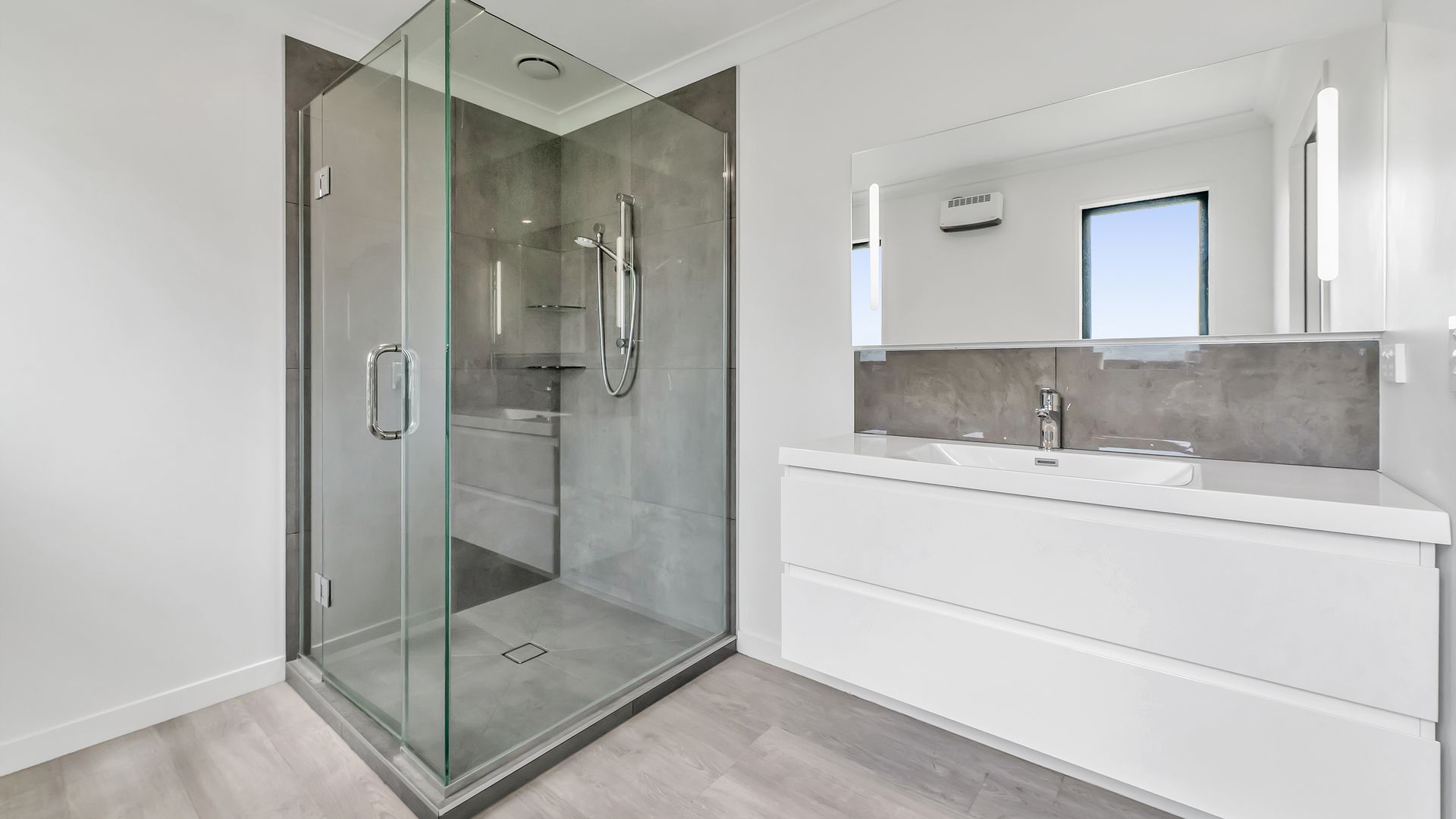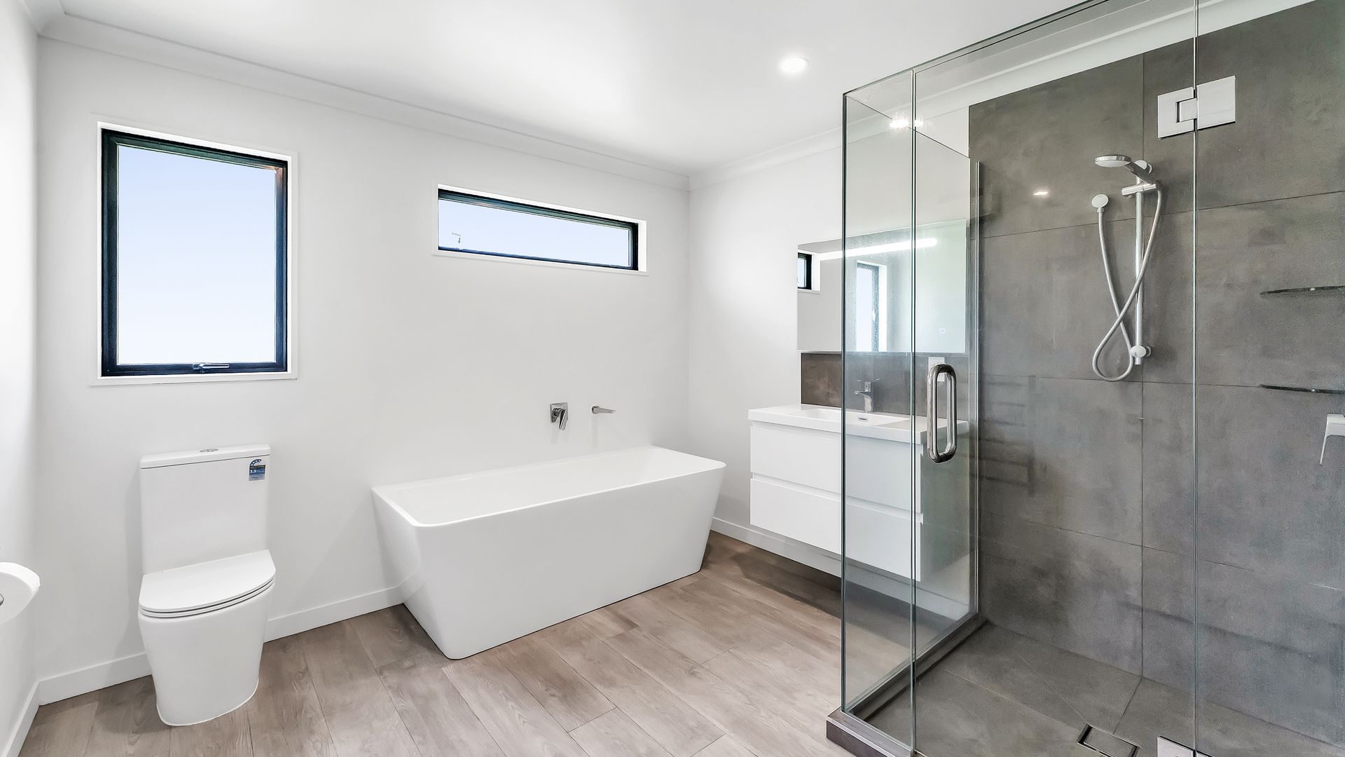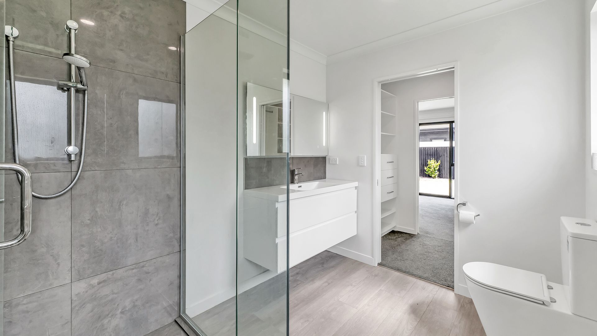 Through the spacious entrance, a sleek, modern kitchen forms the centrepiece of the open-plan living zone, enhanced by a 90cm freestanding oven, ample bench space, and a walk-in pantry. This space flows into the separate lounge, both with sliding door access to the deck.