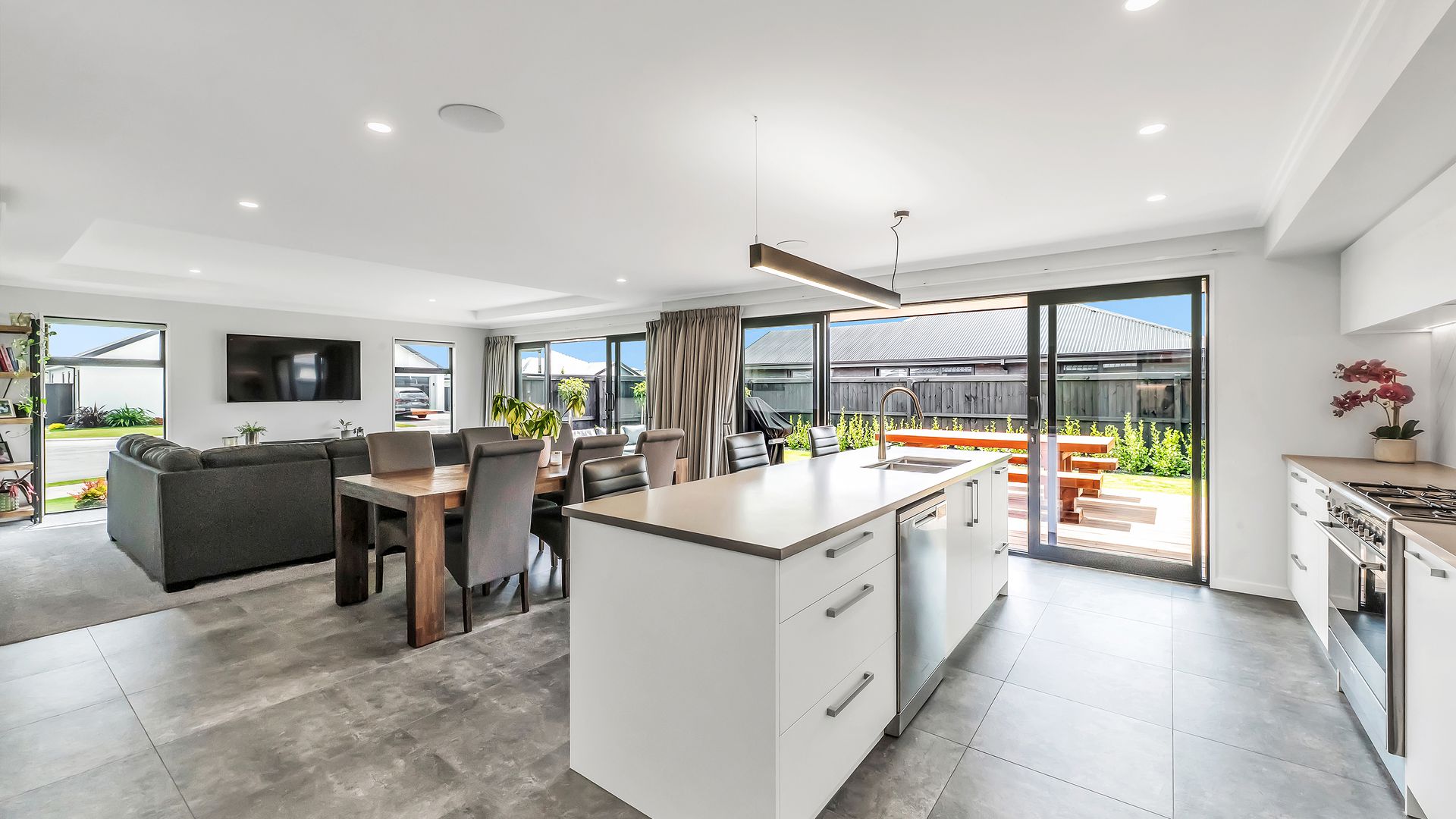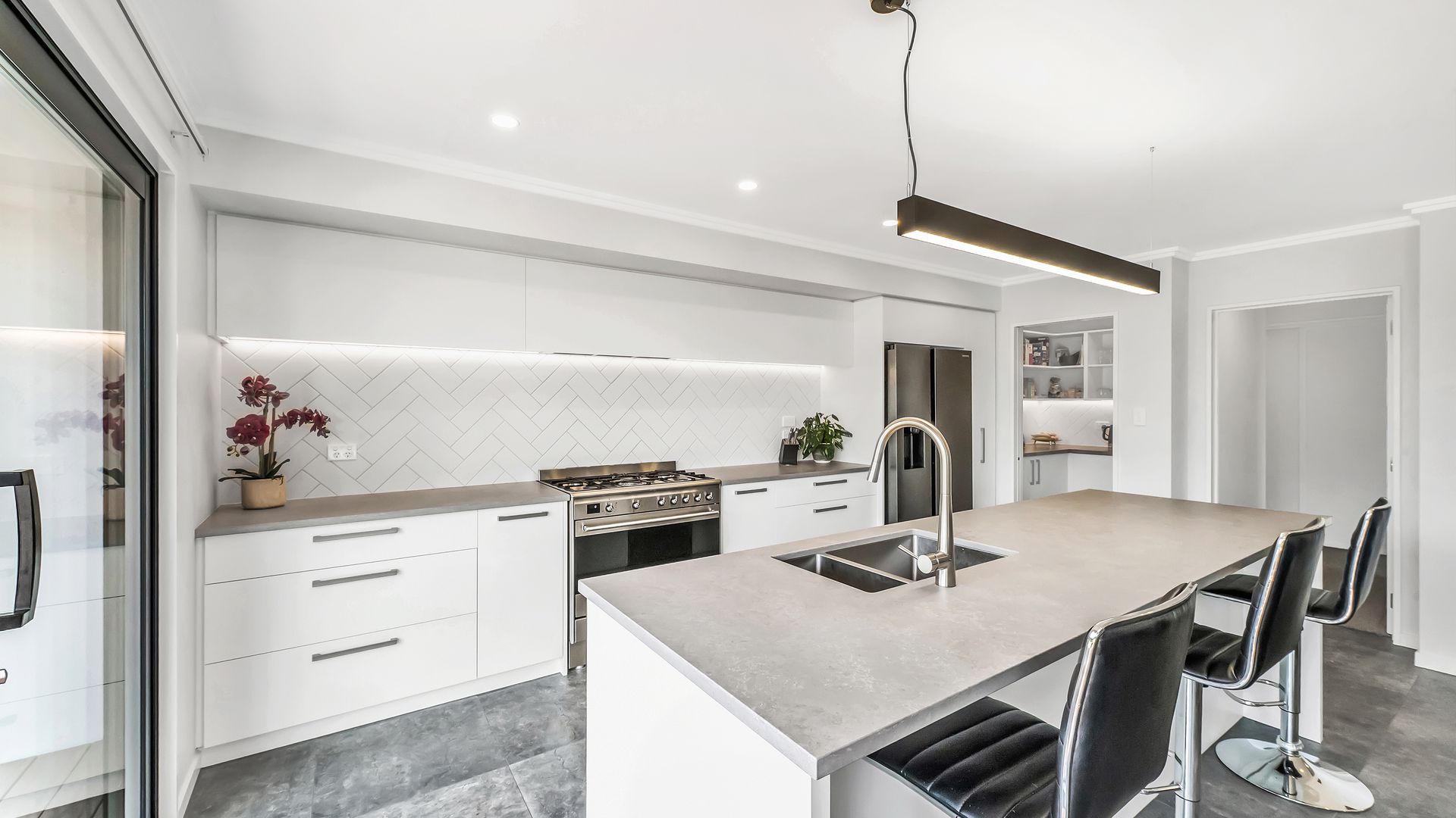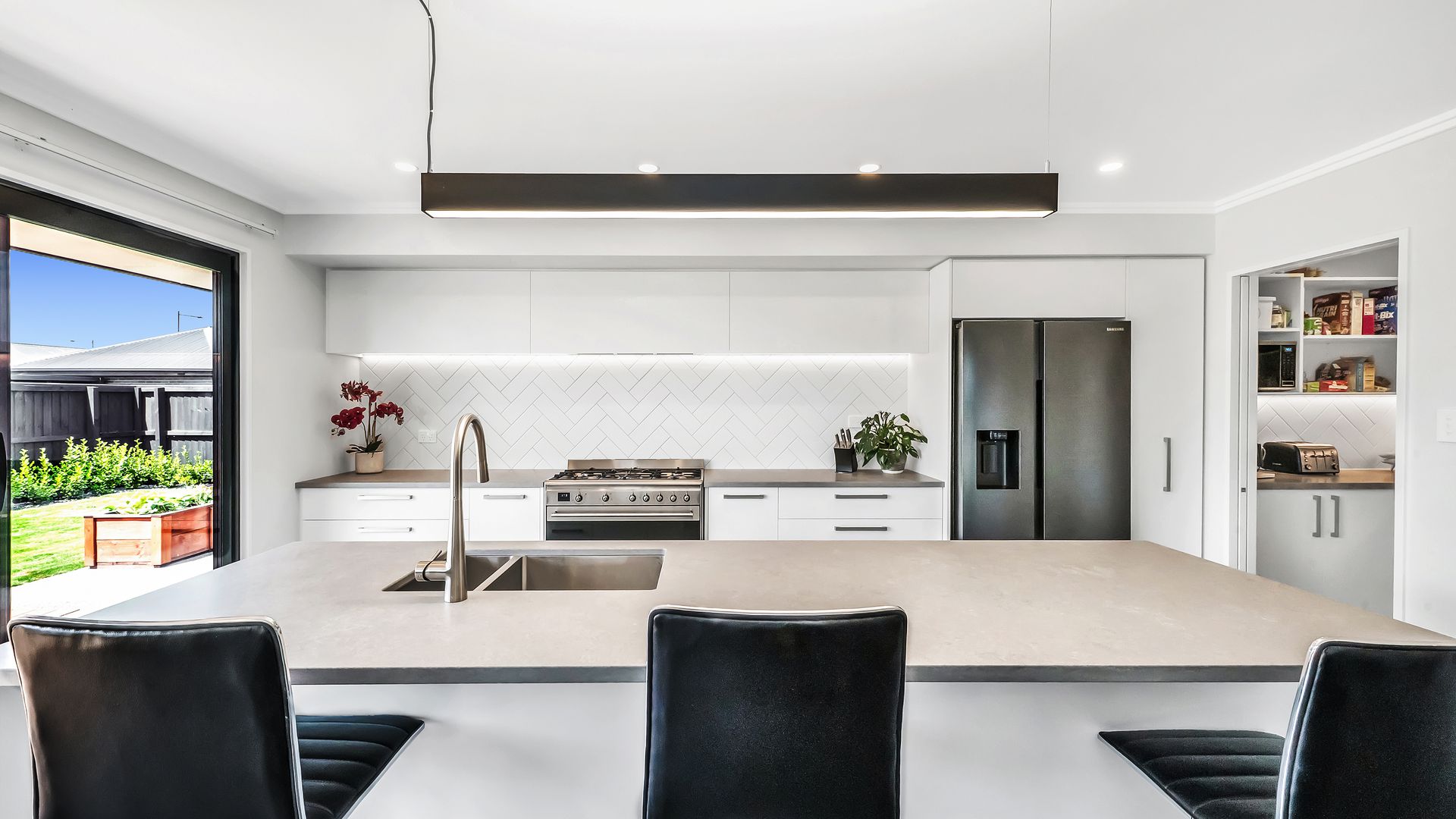 A generous entrance leads you into the heart of the home, where the open-plan kitchen, dining, and living area brings everyone together. The kitchen is both stylish and practical, featuring engineered stone benchtops, a walk-in pantry, and a 90cm gas cooktop, all overlooking the living space with its striking feature ceiling.