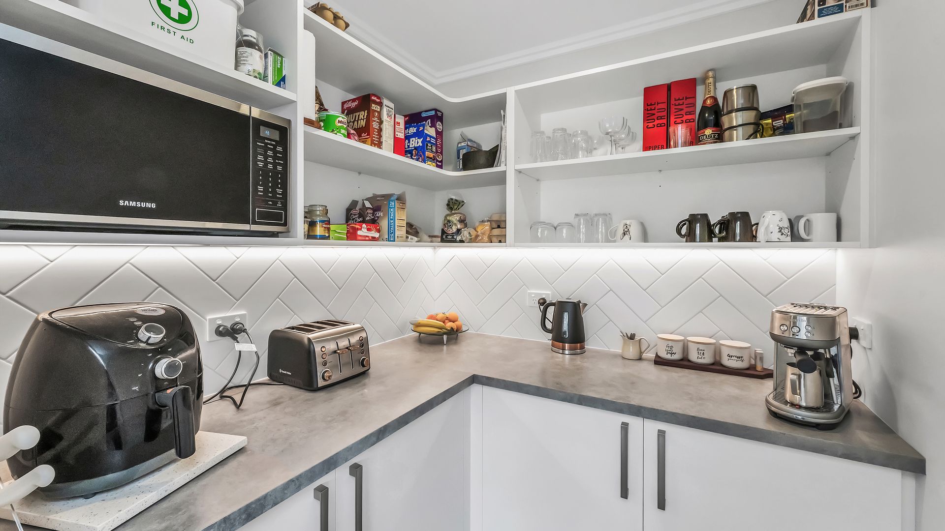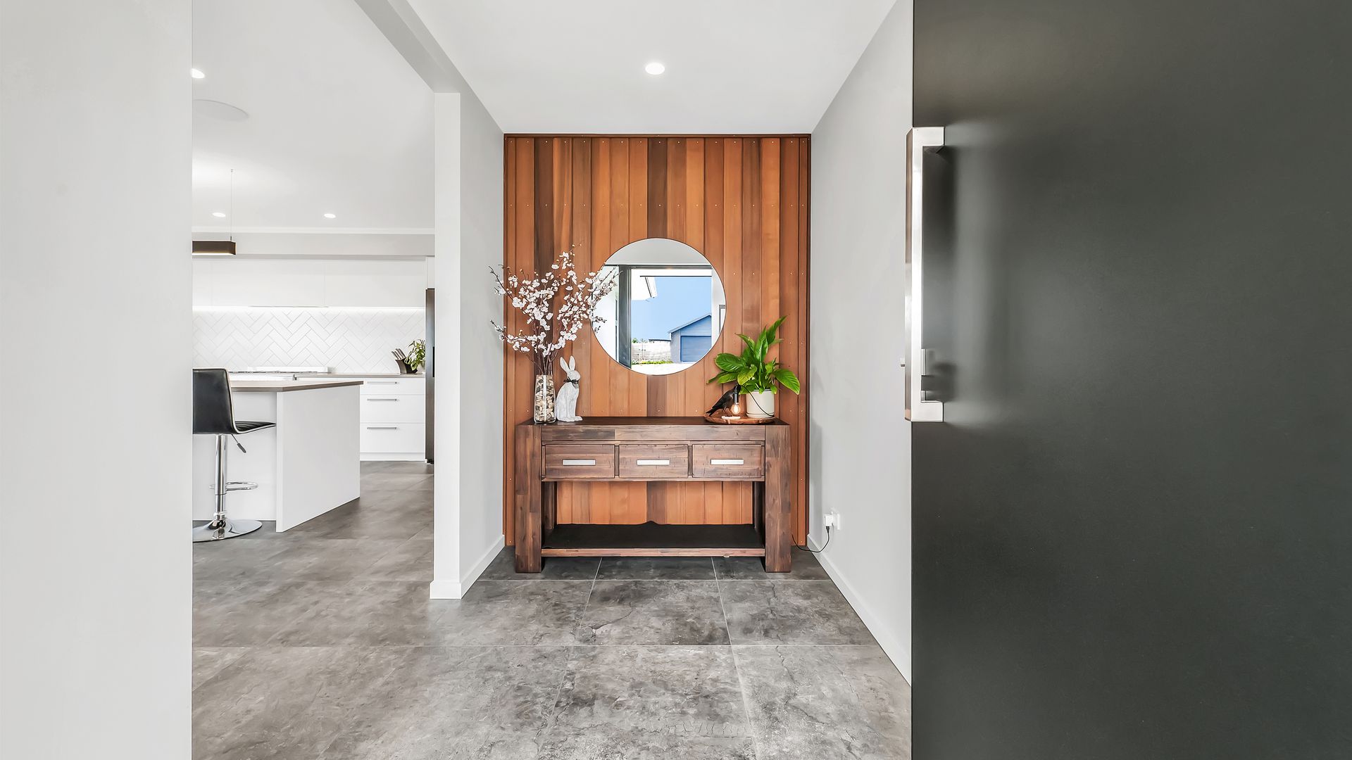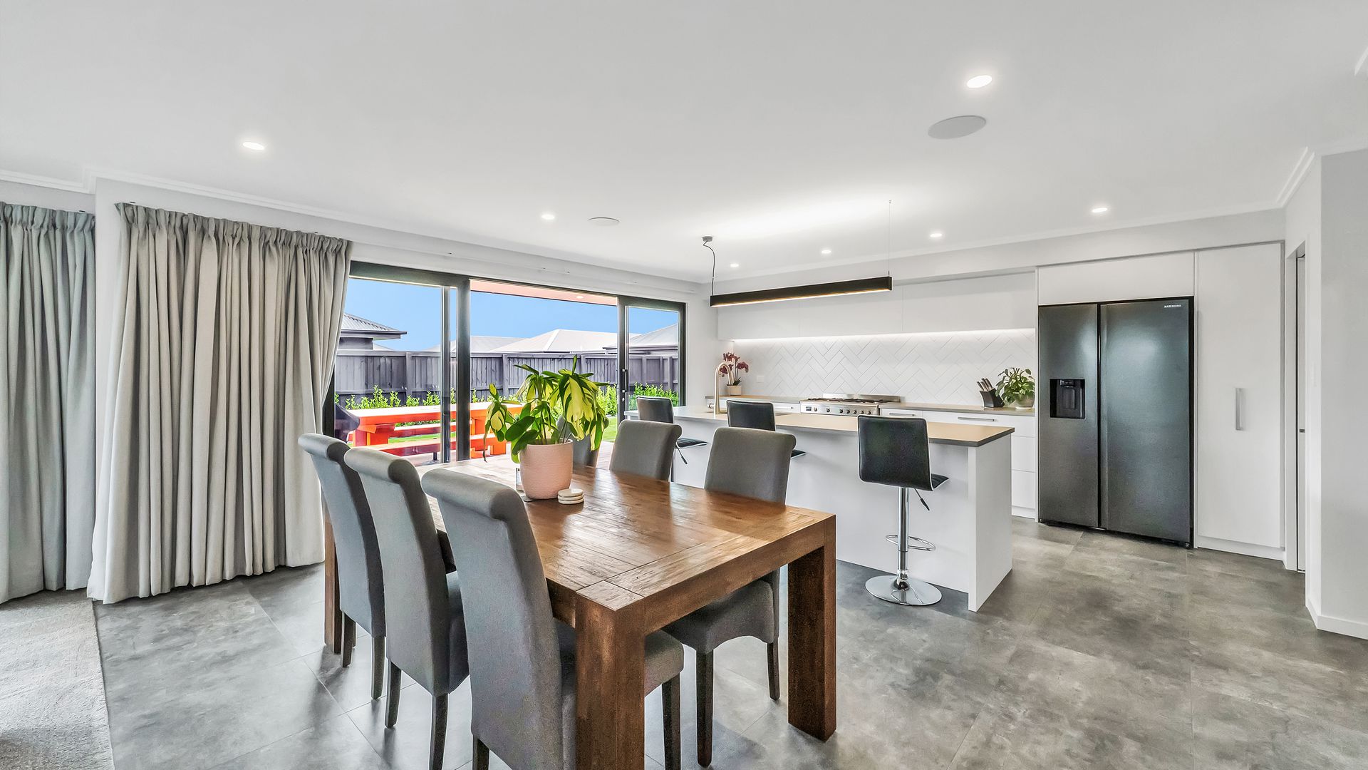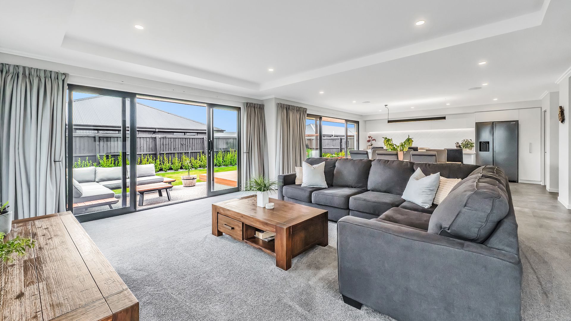 A generous entrance leads you into the heart of the home, where the open-plan kitchen, dining, and living area brings everyone together. The kitchen is both stylish and practical, featuring engineered stone benchtops, a walk-in pantry, and a 90cm gas cooktop, all overlooking the living space with its striking feature ceiling.