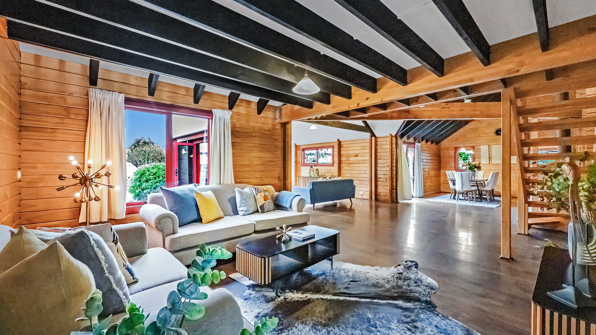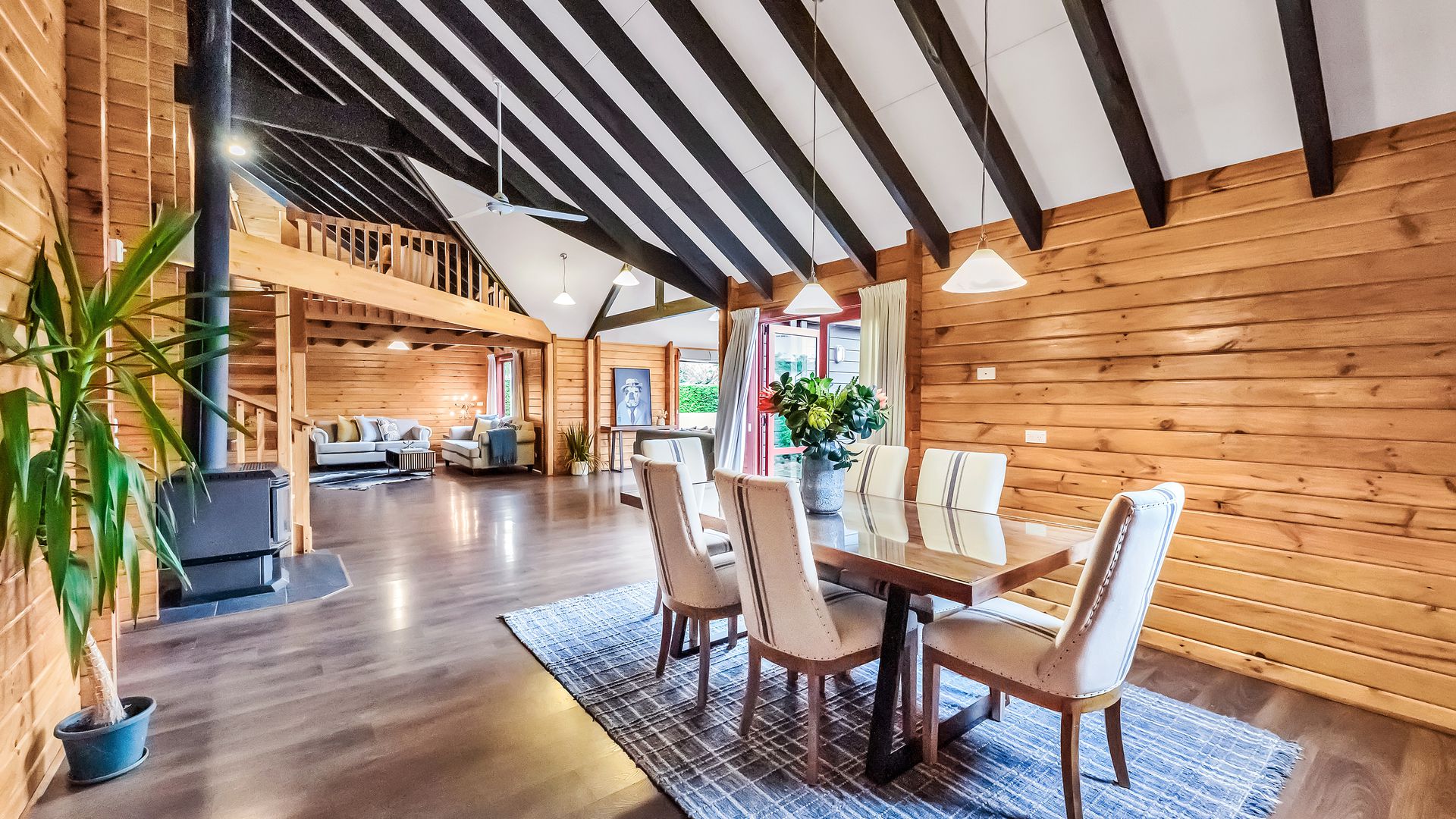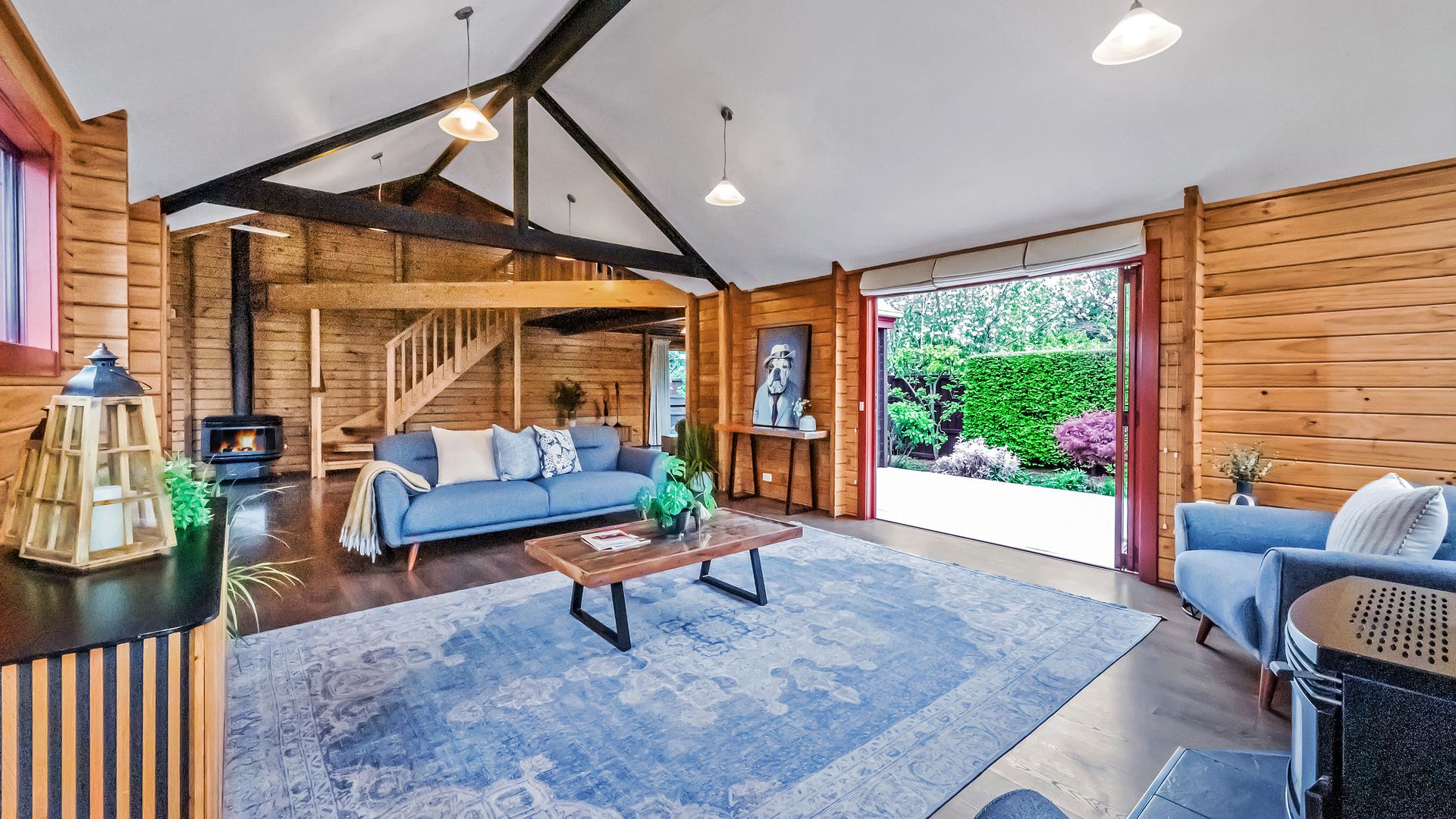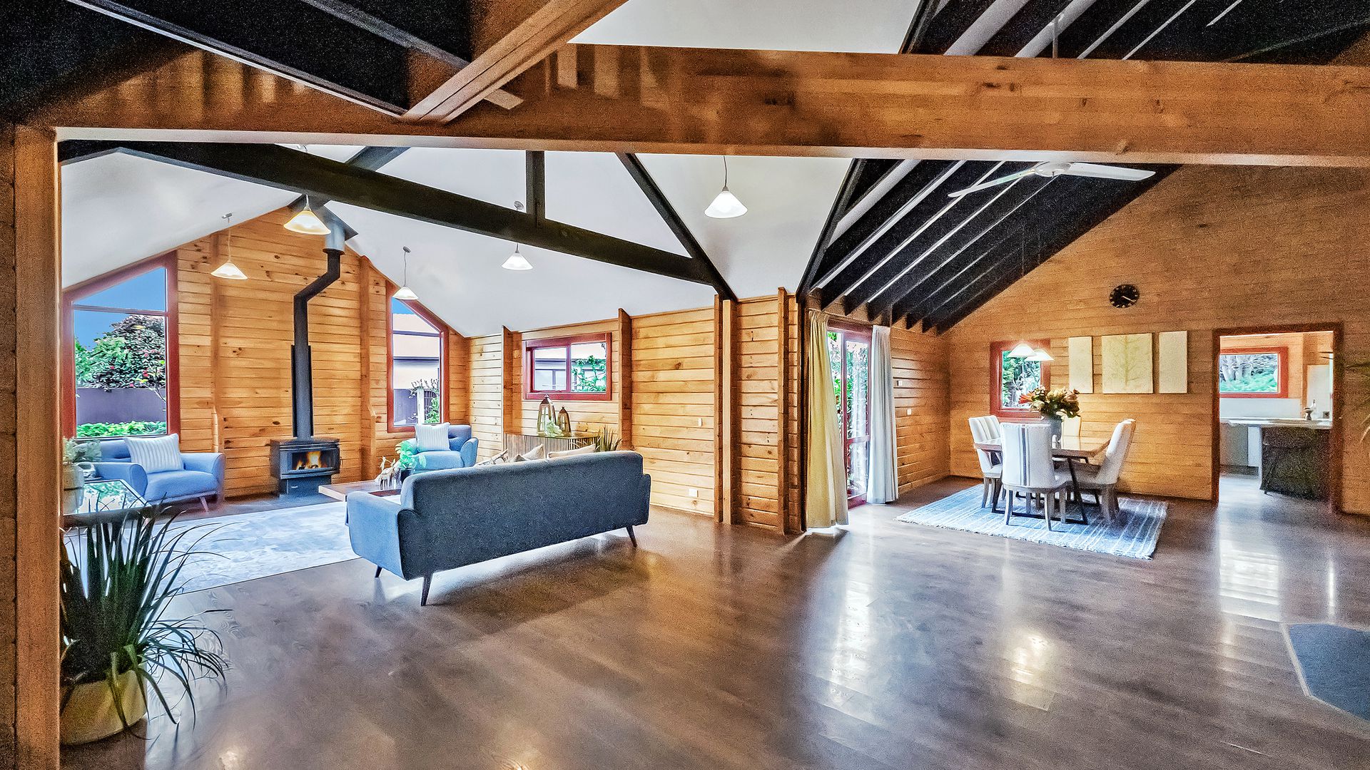 Positioned in the very heart of the township, this exceptional solid-timber residence stands apart for its craftsmanship, scale, and versatility. Designed with striking raised ceilings, exposed joints, and impressive loft spaces, it’s a home that celebrates both architectural character and functional living. Inside, the main living area makes an immediate statement with its soaring ceilings and dual log burners, creating a warm, inviting centrepiece that’s equally suited to entertaining or family life. French and stacker doors draw the outdoors in, opening to expansive decking and a sun-soaked concrete patio.