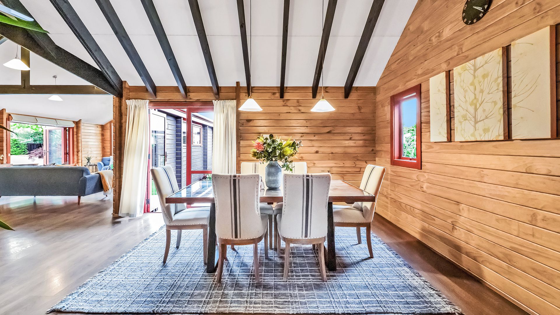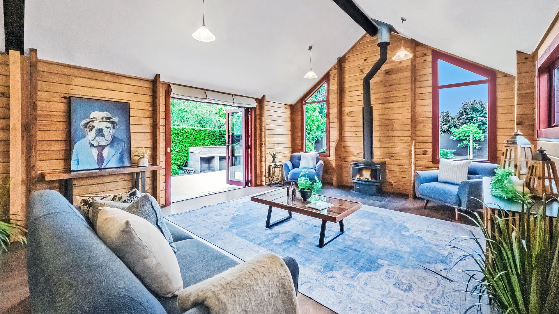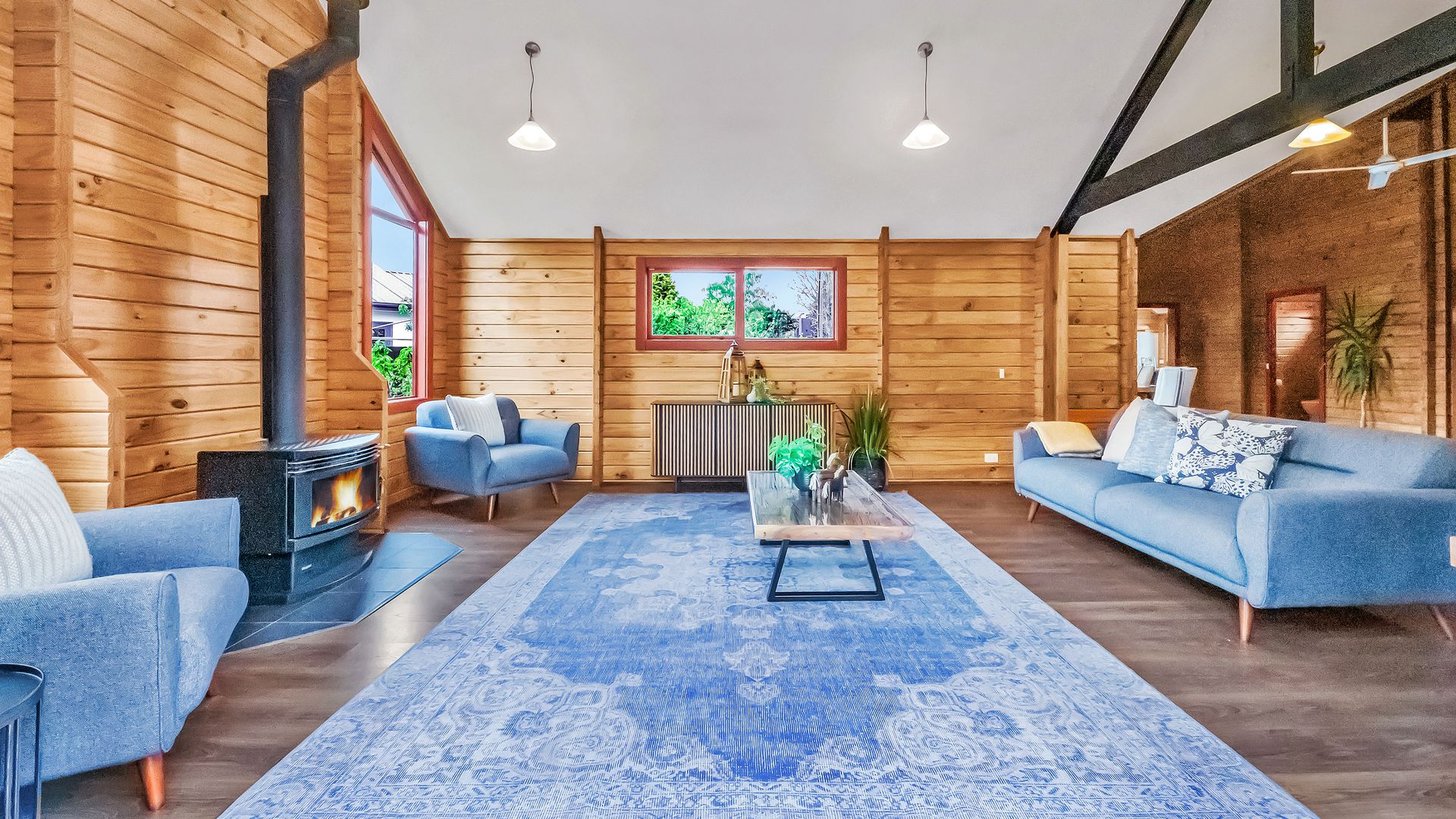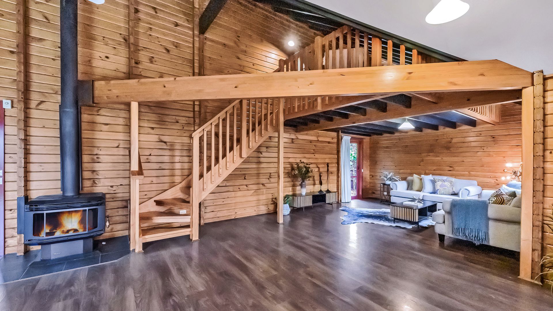 Positioned in the very heart of the township, this exceptional solid-timber residence stands apart for its craftsmanship, scale, and versatility. Designed with striking raised ceilings, exposed joints, and impressive loft spaces, it’s a home that celebrates both architectural character and functional living. Inside, the main living area makes an immediate statement with its soaring ceilings and dual log burners, creating a warm, inviting centrepiece that’s equally suited to entertaining or family life. French and stacker doors draw the outdoors in, opening to expansive decking and a sun-soaked concrete patio.